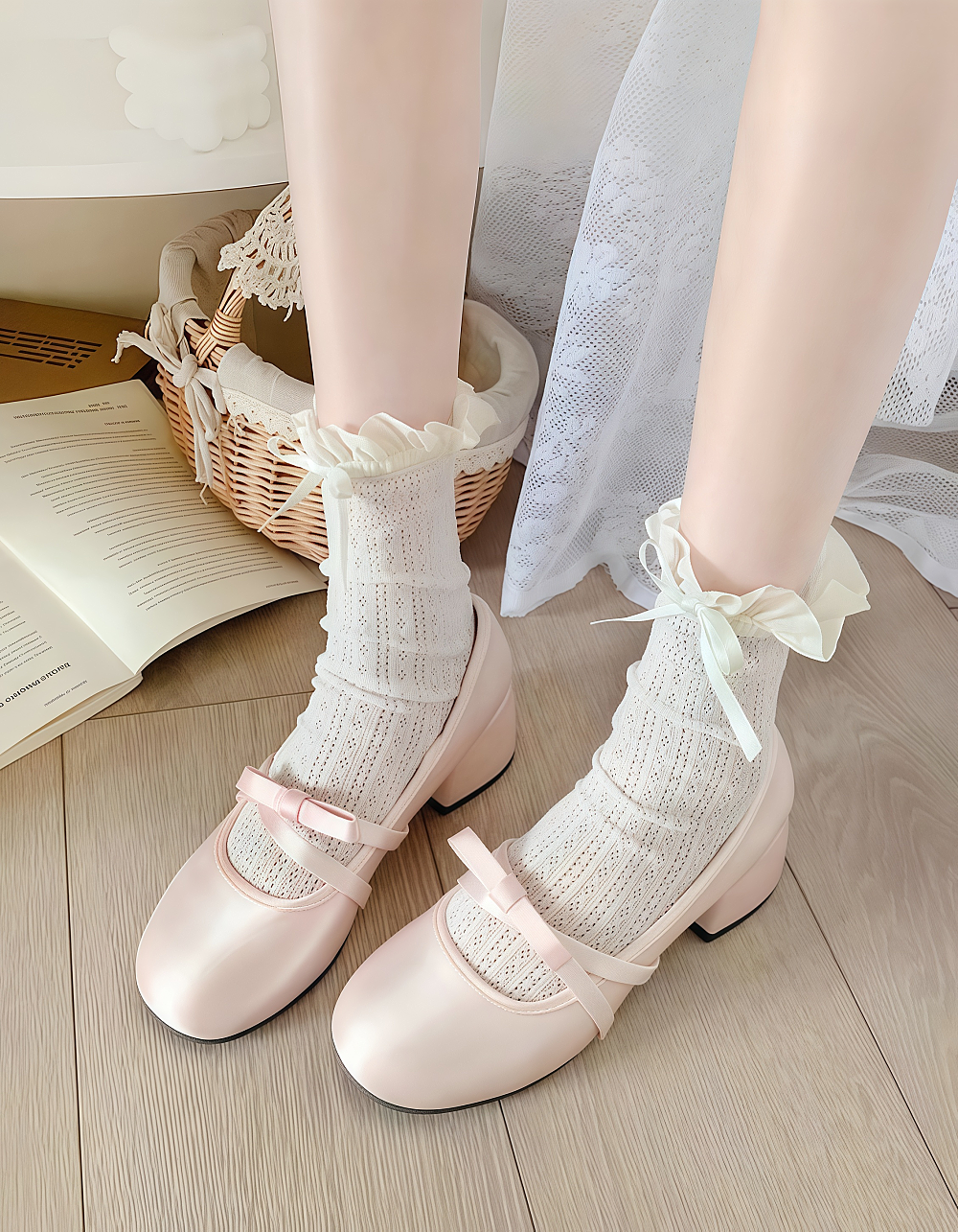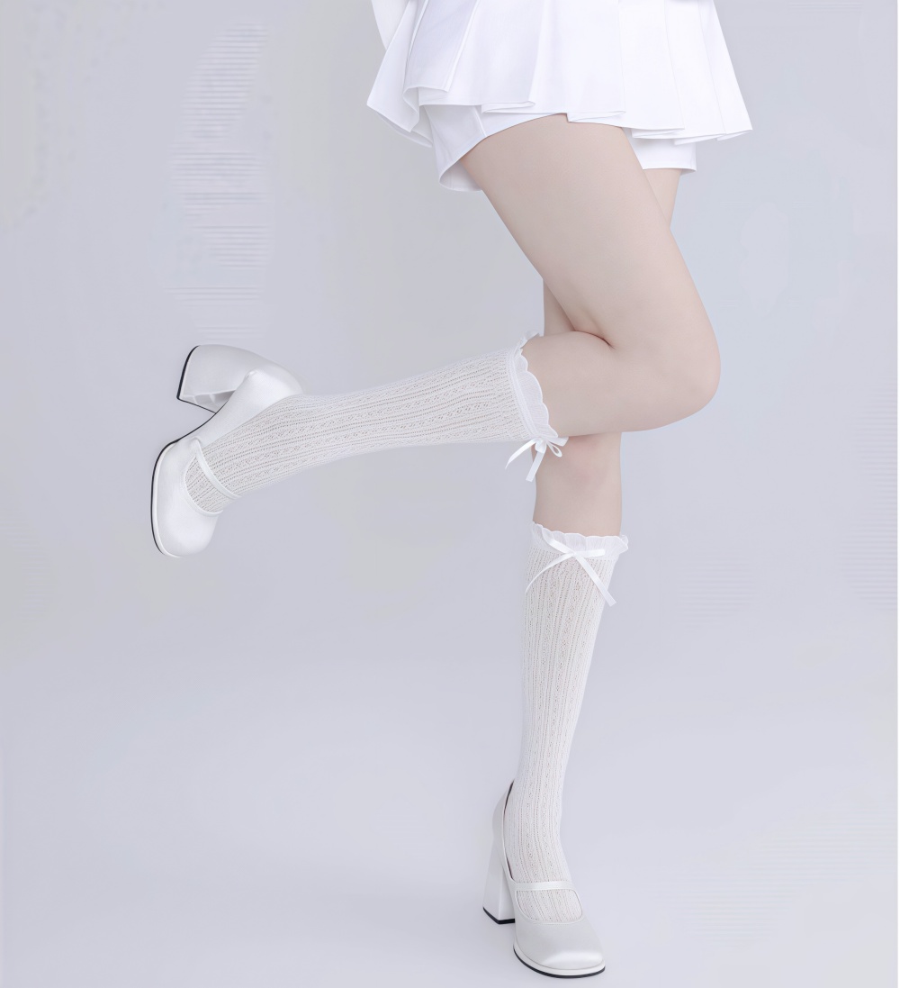 蝴蝶結蕾絲襪子女春秋季款中筒芭蕾風Lolita瑪麗珍白色花邊堆堆襪