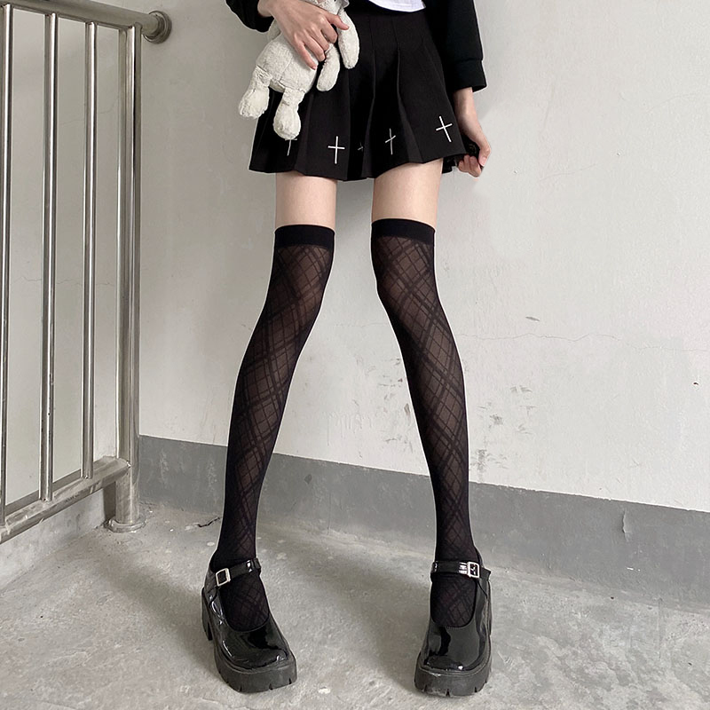 夜間教習室長筒襪女春秋款過膝黑色襪子菱格大腿jk高筒絲襪日系夏