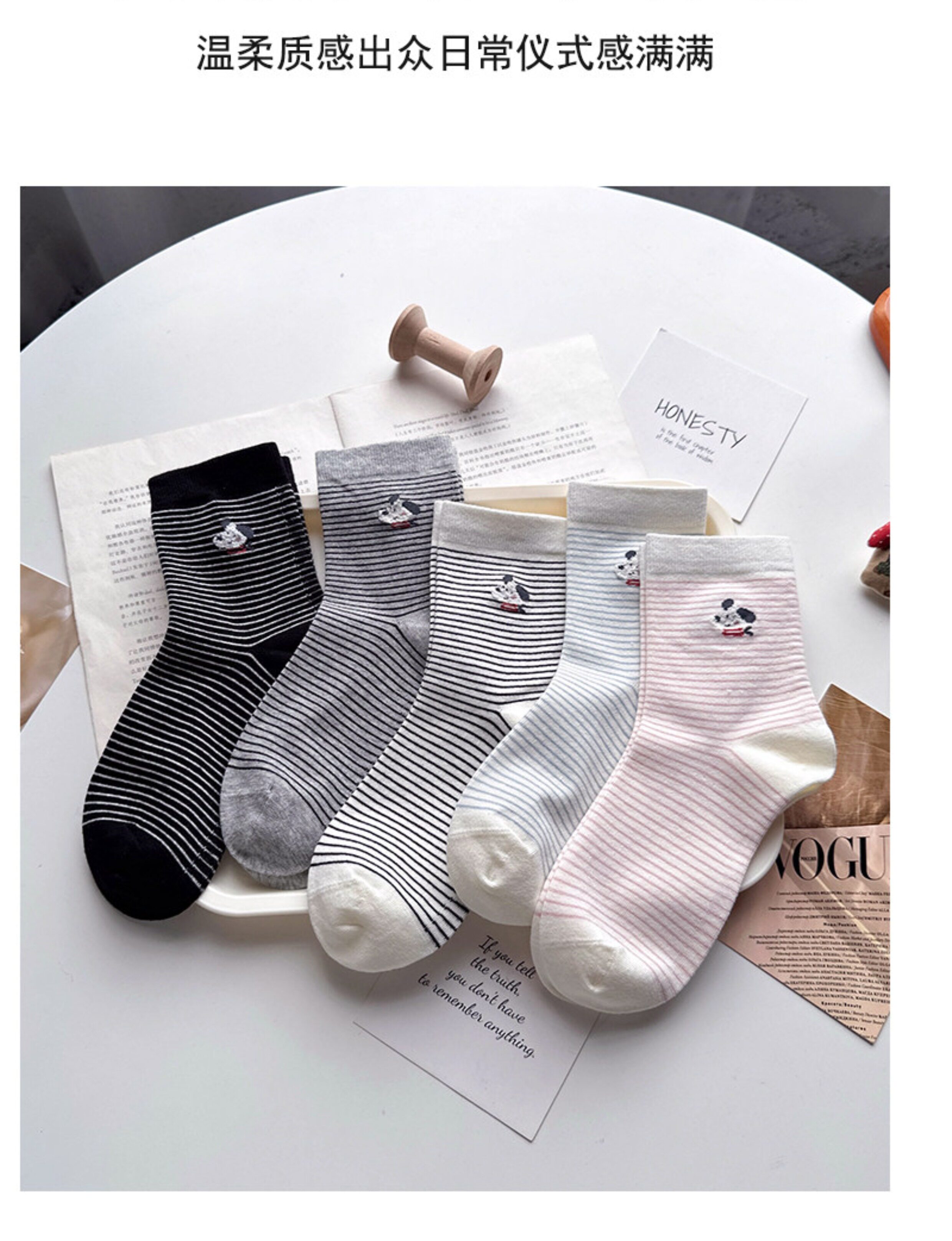 韓系甜美風純棉襪子女生卡通小狗細條紋短襪初中生防臭中筒無骨襪