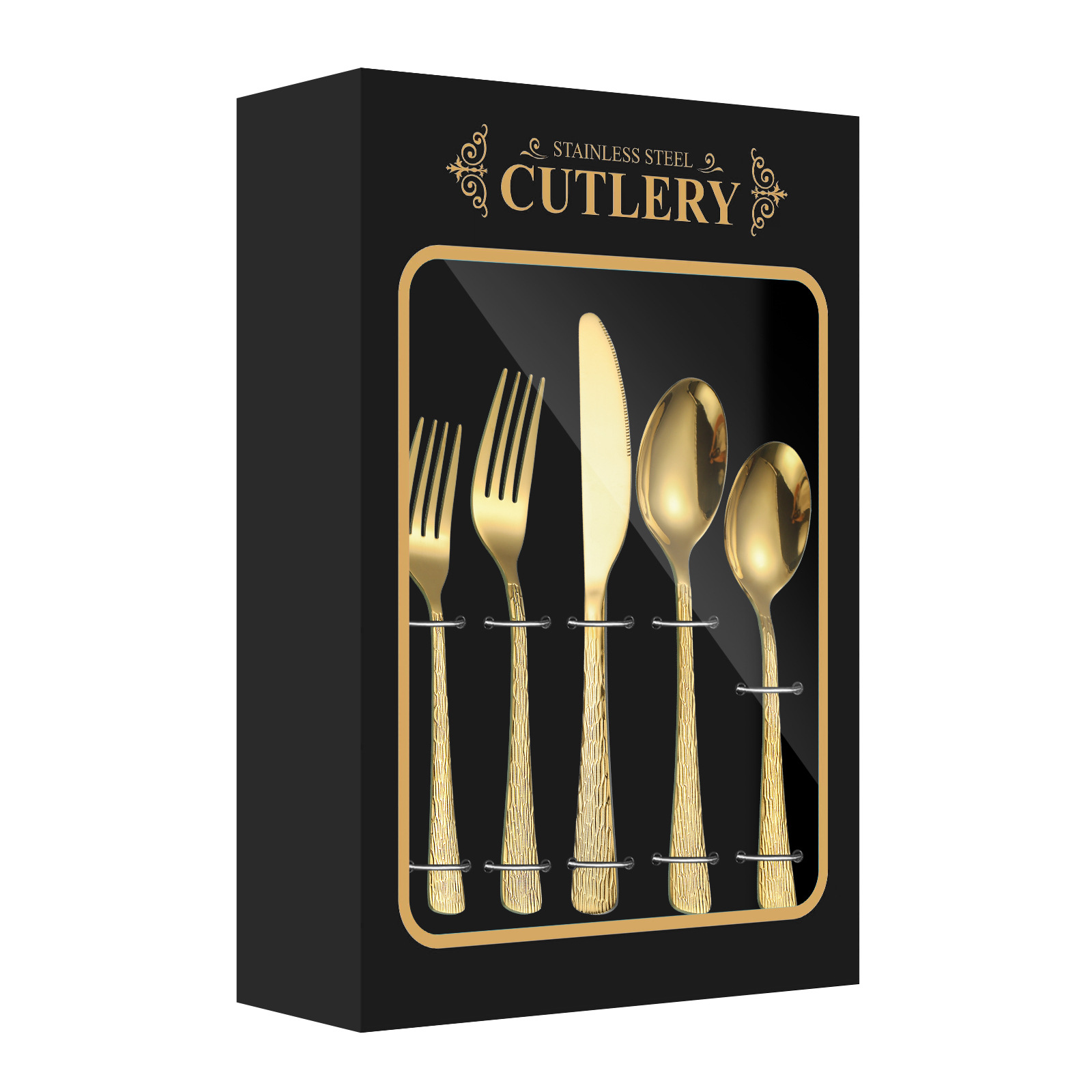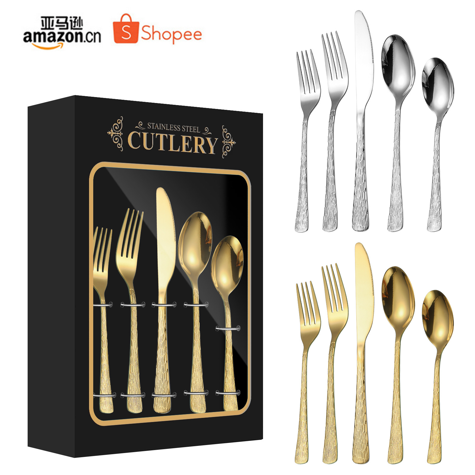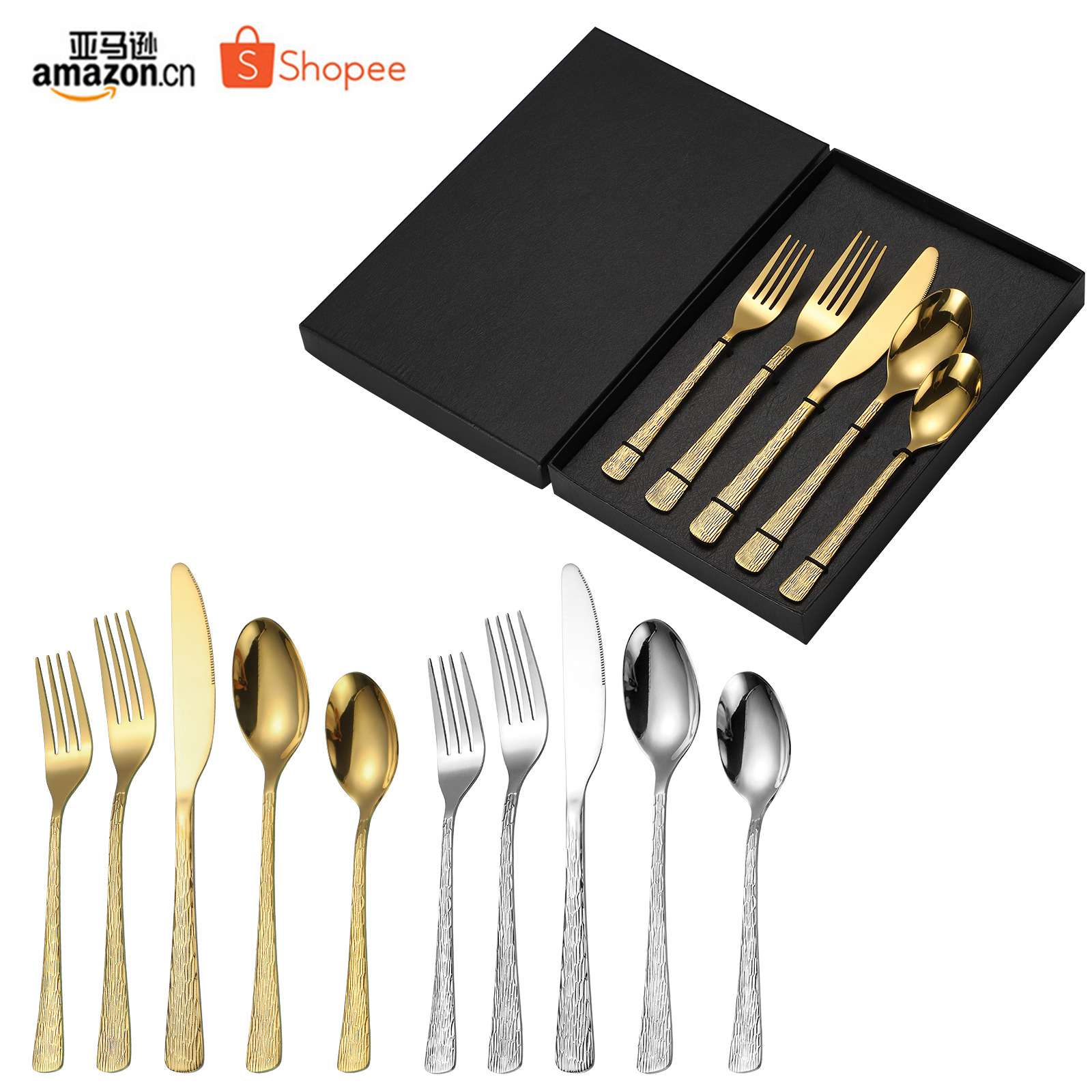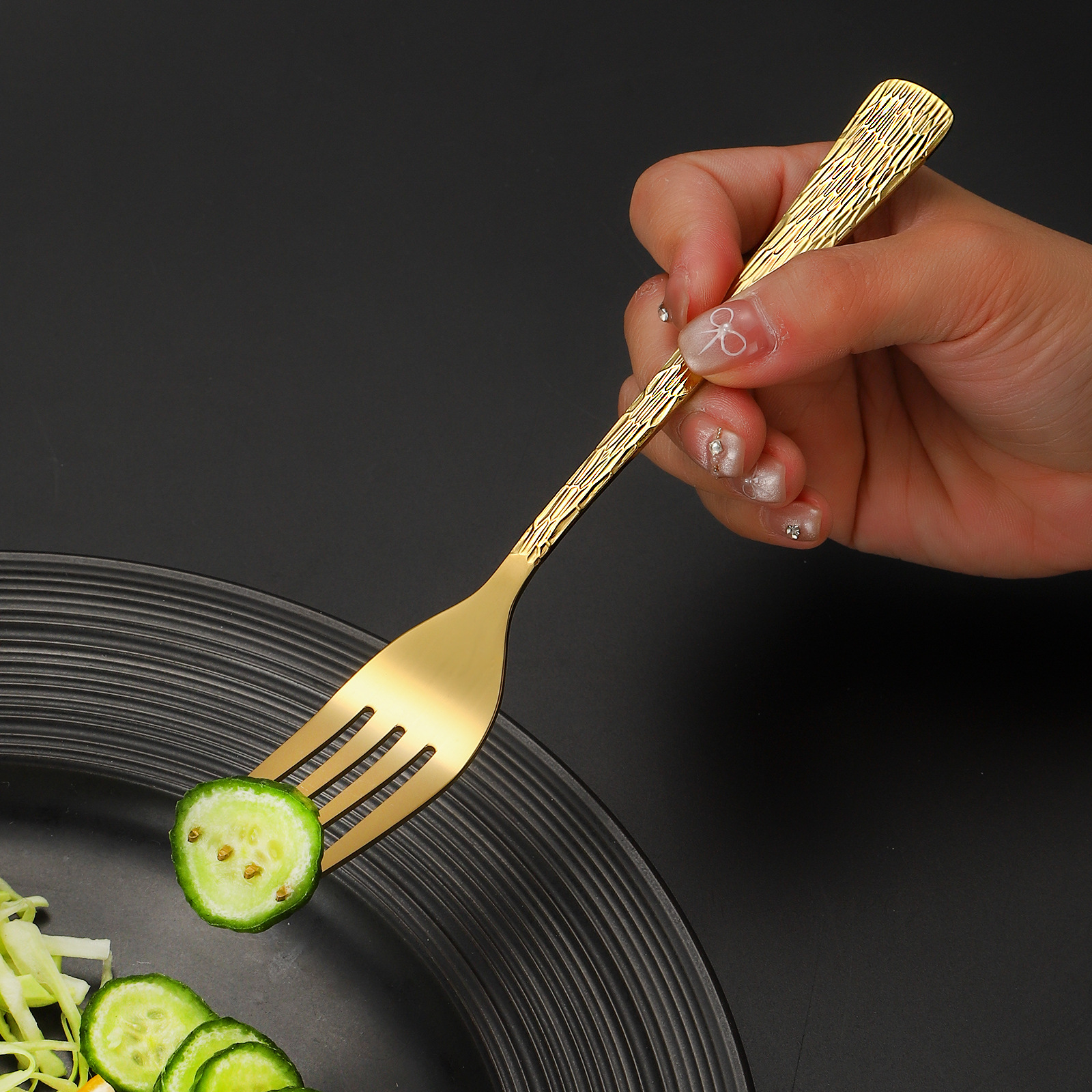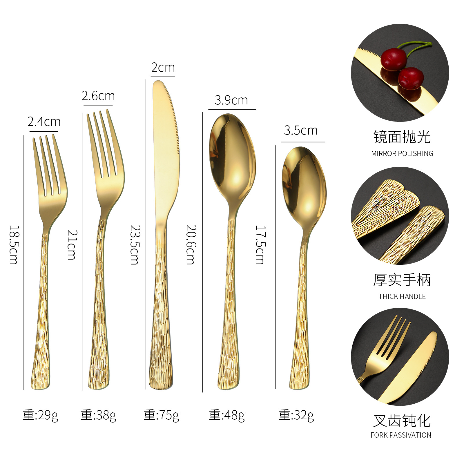 新款樹紋手柄不鏽鋼刀叉勺 創意鎚紋西餐牛排刀甜品勺叉5件套