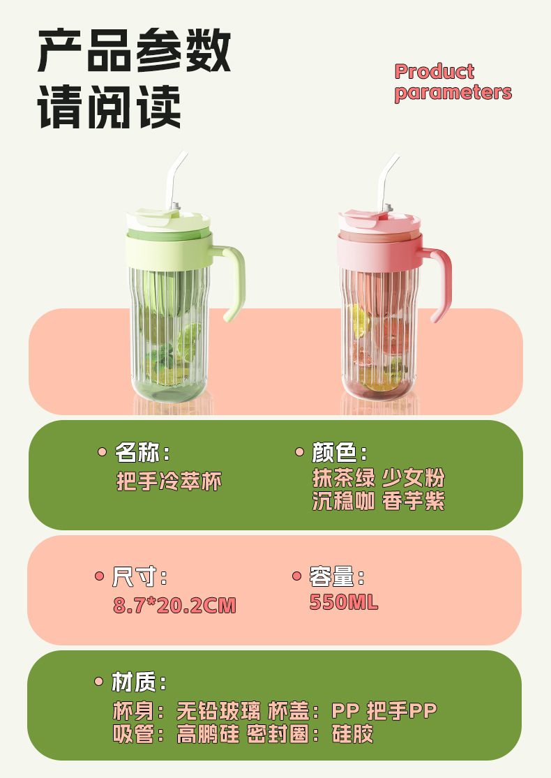 高顔值大容量玻璃杯水杯吸琯杯茶水分離泡茶杯帶把手杯子冰霸杯