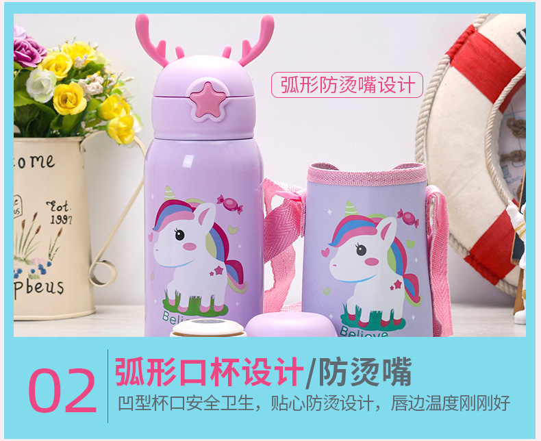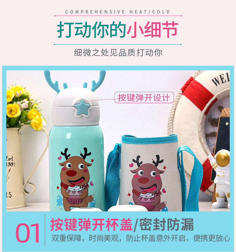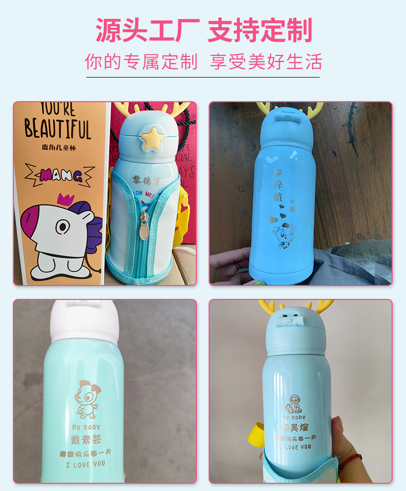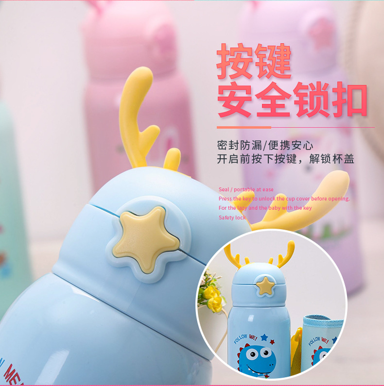 兒童吸管杯大容量可攜式卡通兒童水壺316不鏽鋼鹿角兒童保溫杯