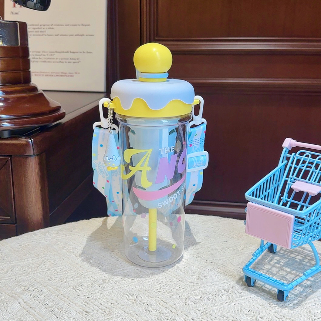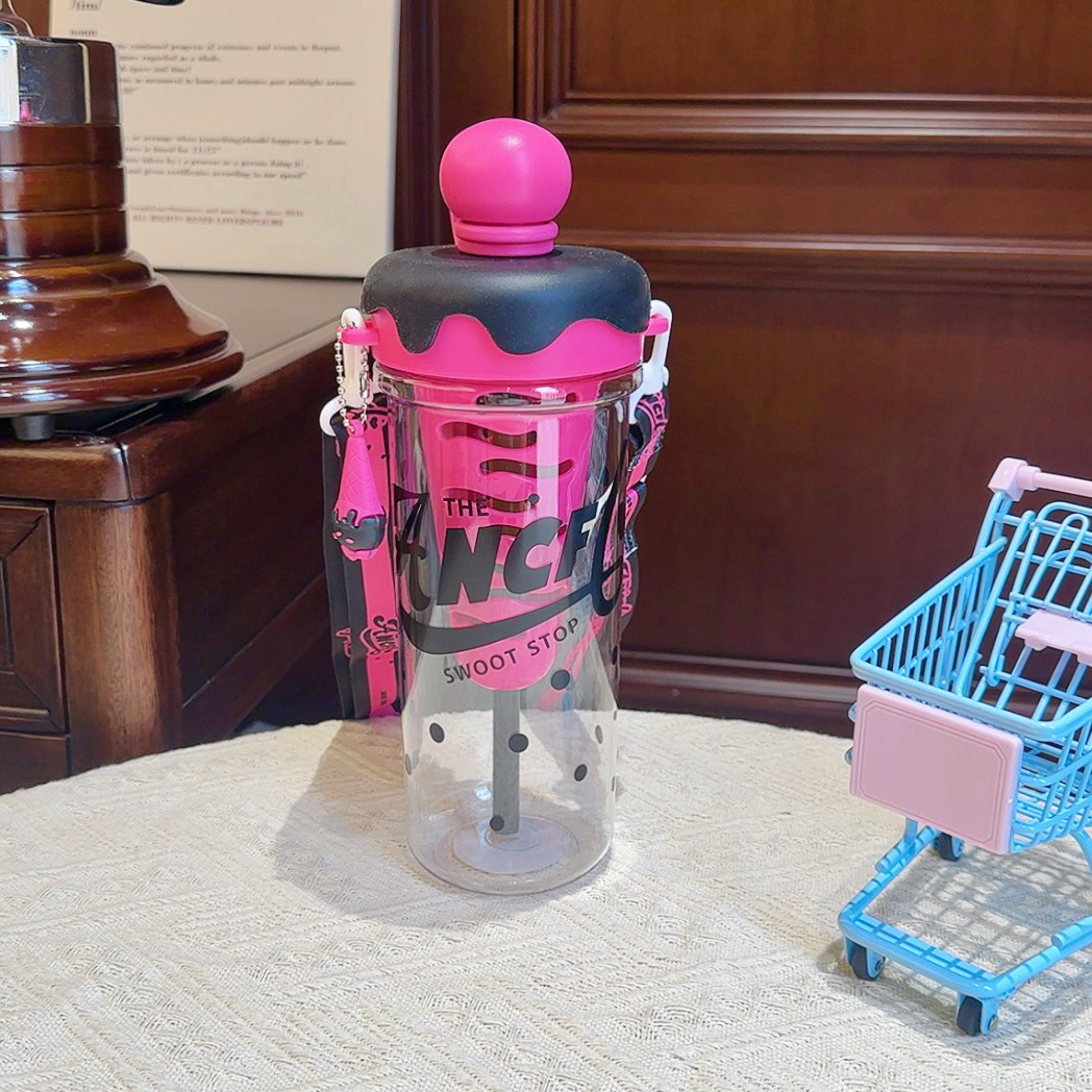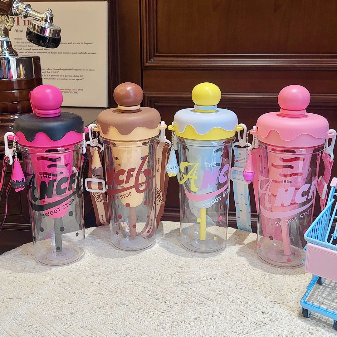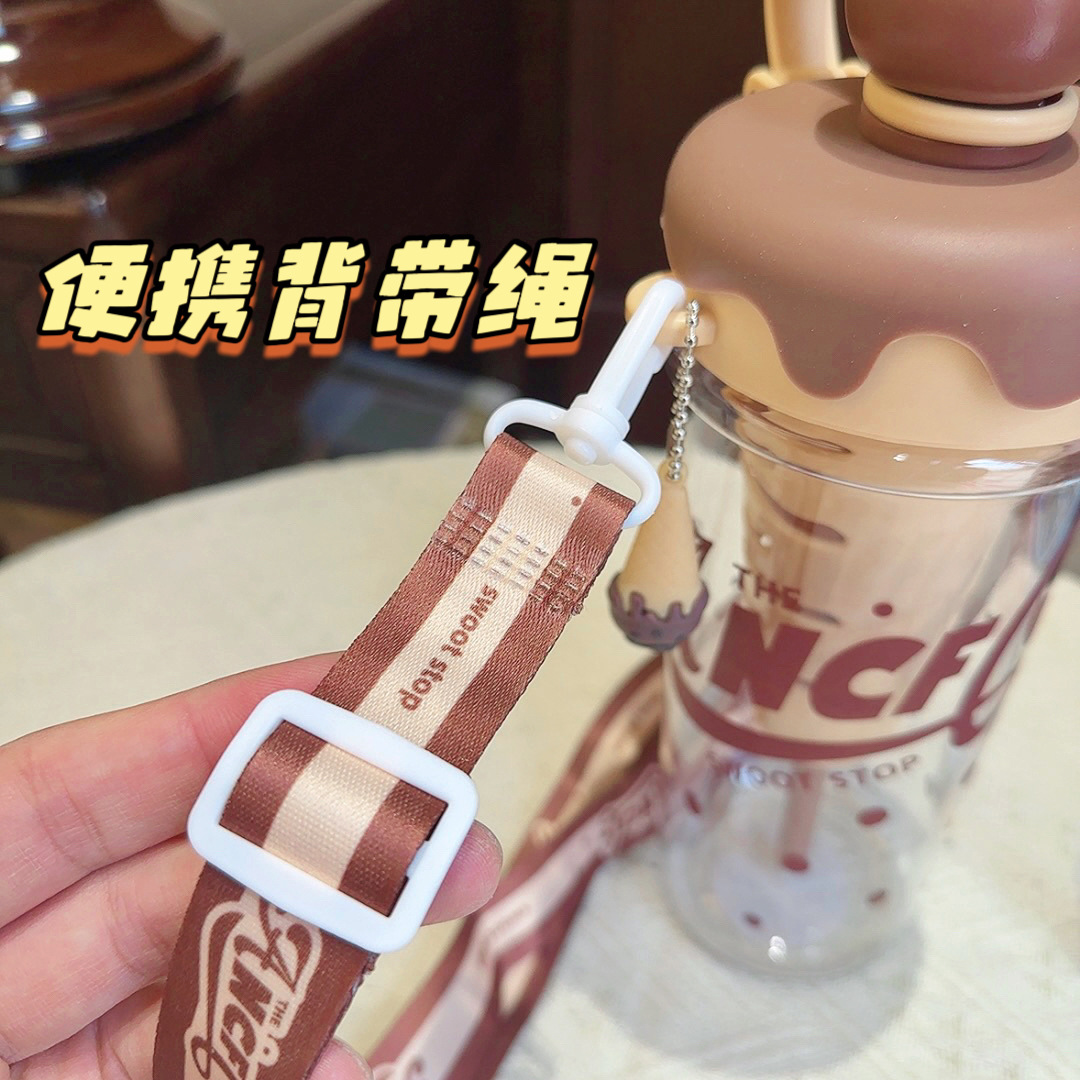 大容量可攜式背帶塑膠杯高顔值女生斜背吸琯杯子學生冰淇淋太空水壺