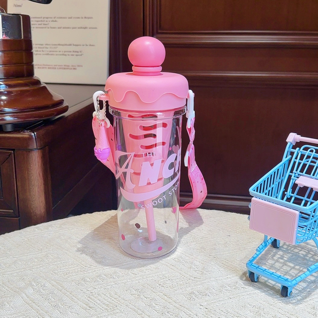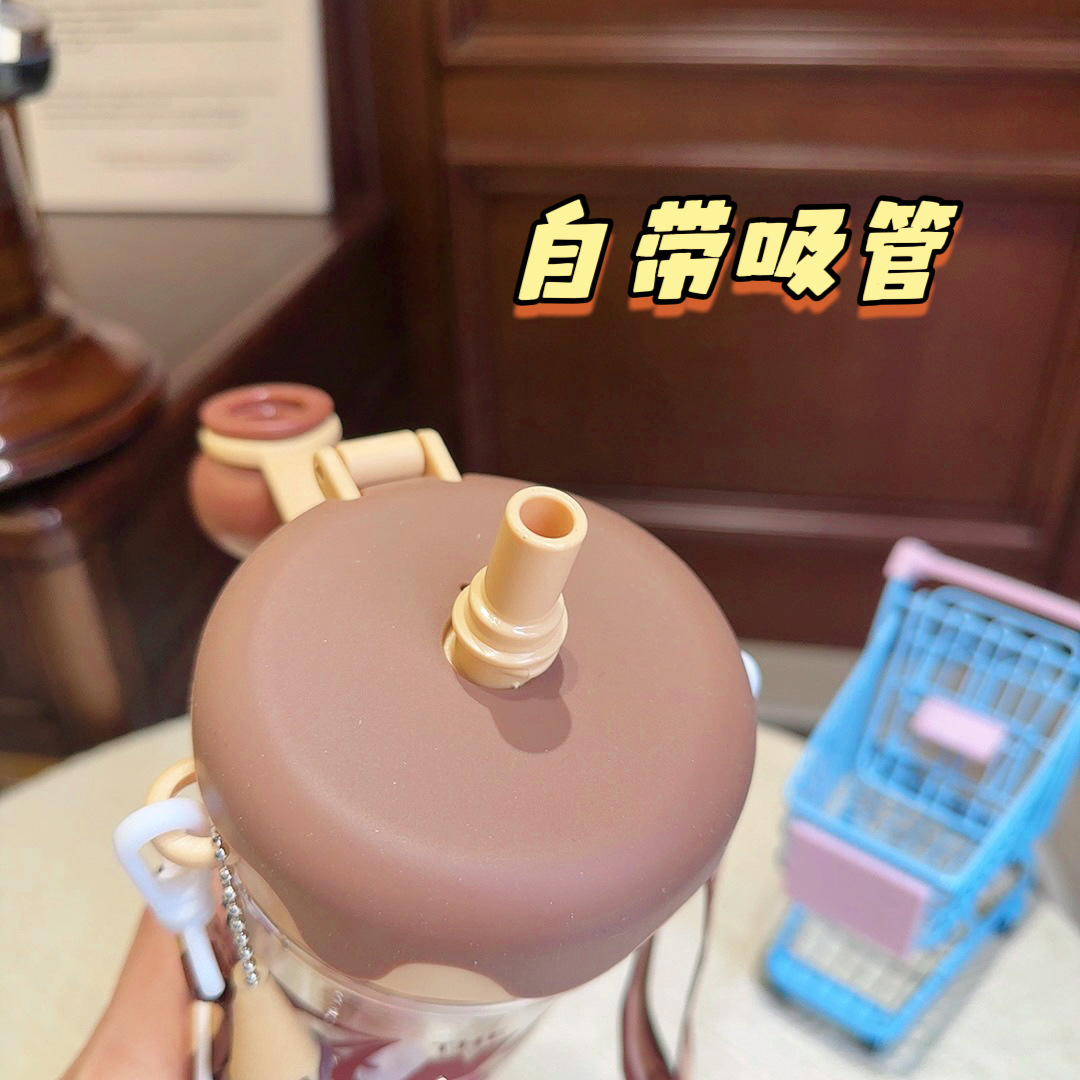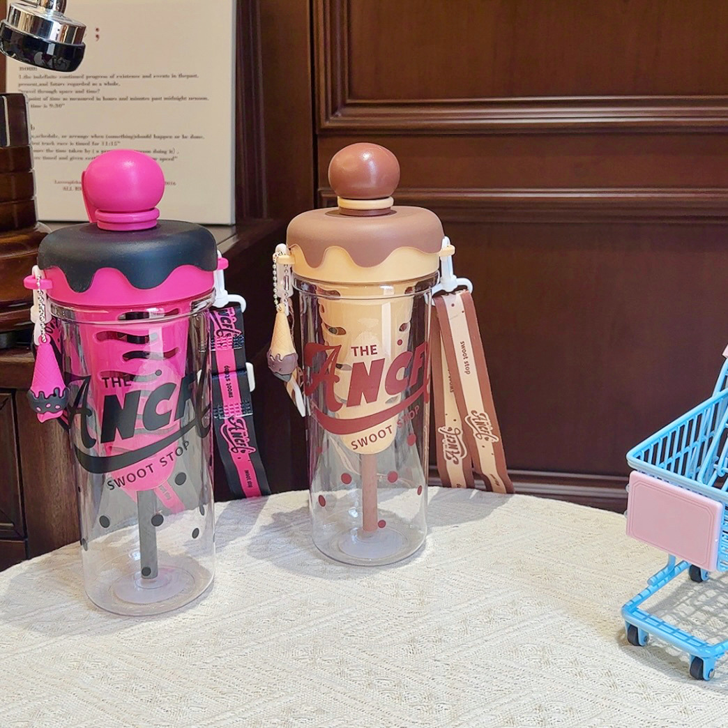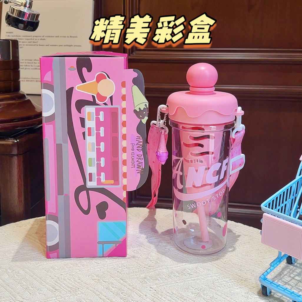 大容量可攜式背帶塑膠杯高顔值女生斜背吸琯杯子學生冰淇淋太空水壺