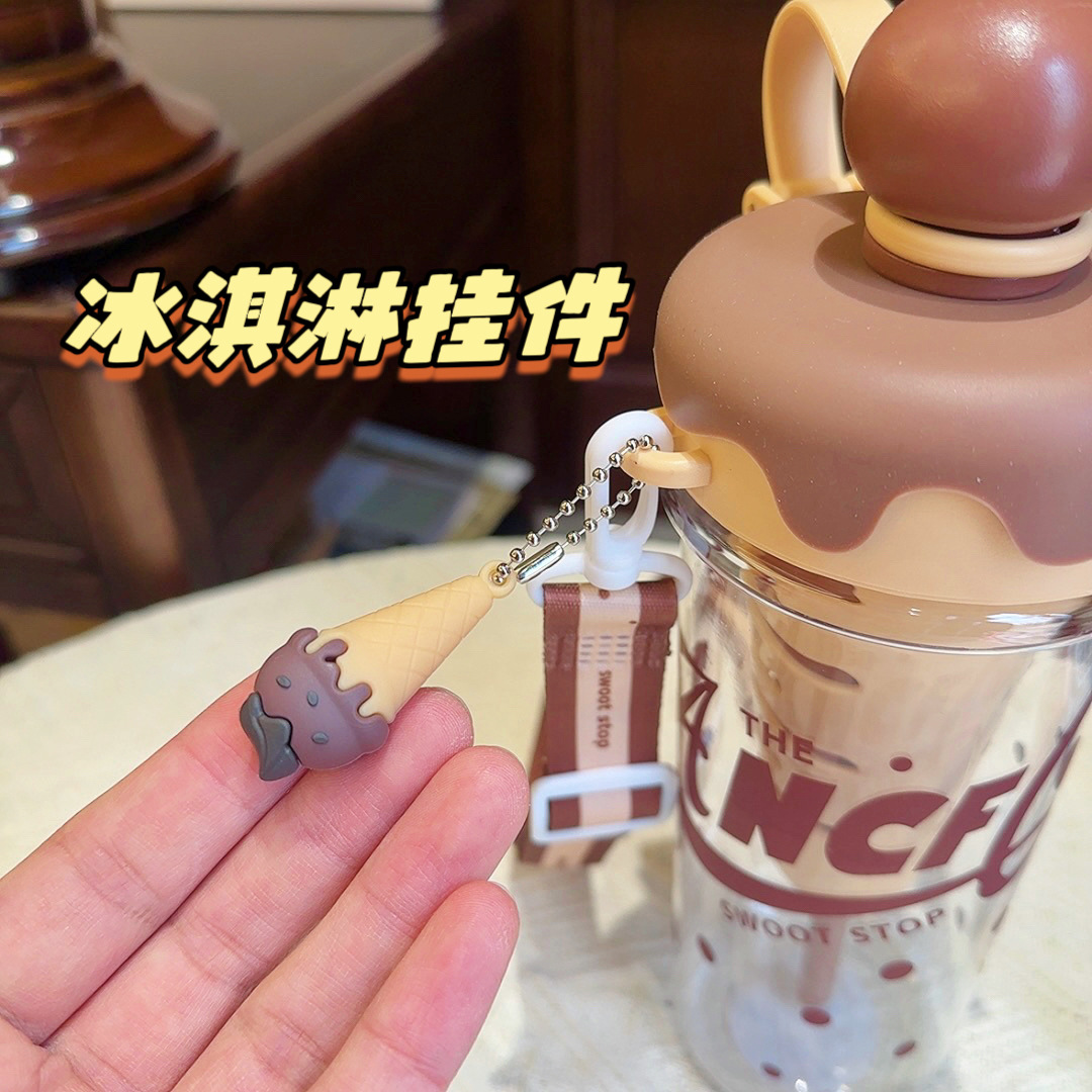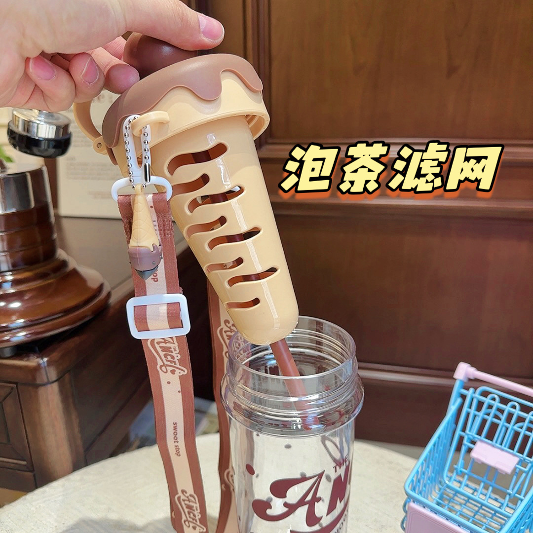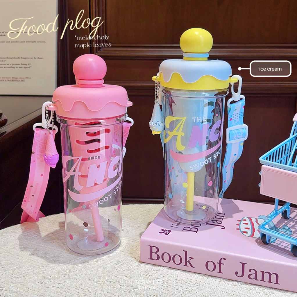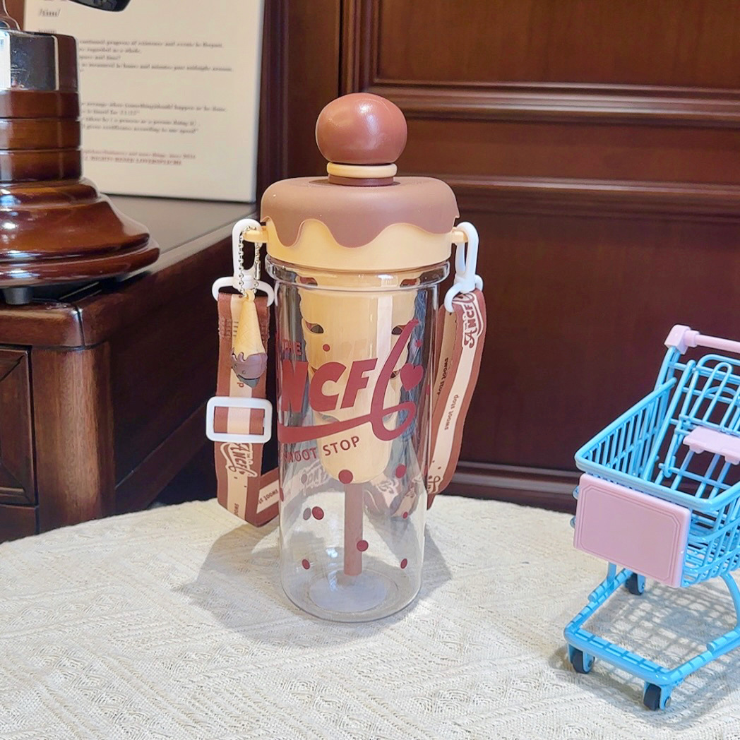 大容量可攜式背帶塑膠杯高顔值女生斜背吸琯杯子學生冰淇淋太空水壺