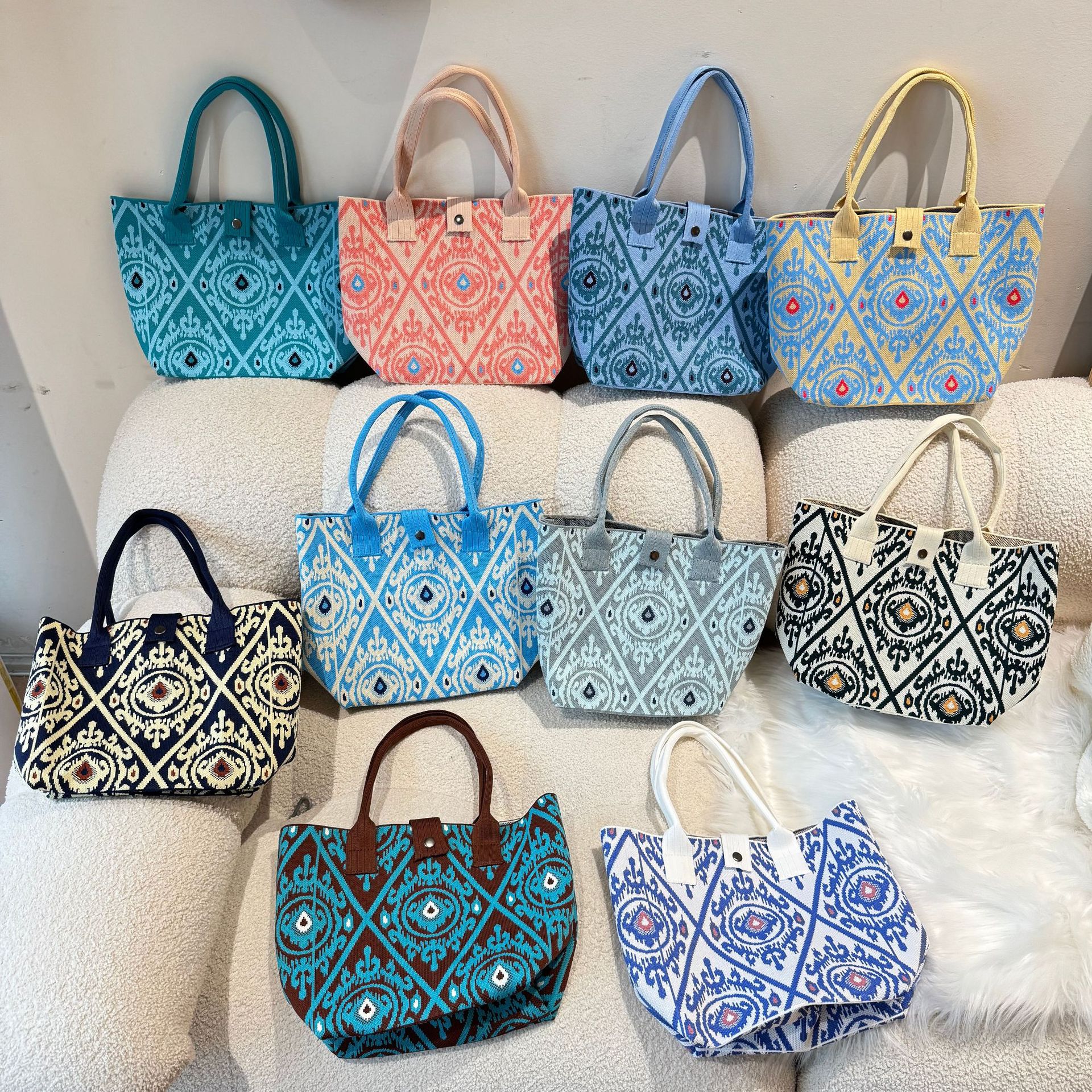 2025新款針織包新疆艾德萊斯花紋手提包包旅遊大容量民族風編織包