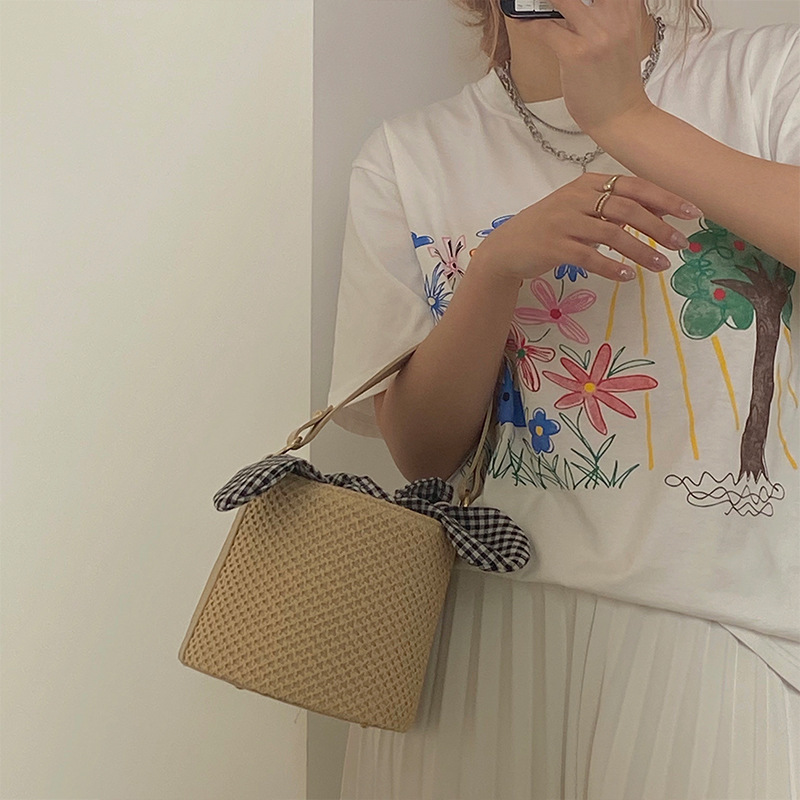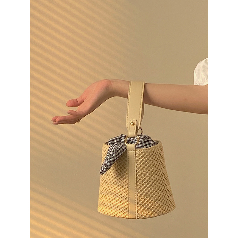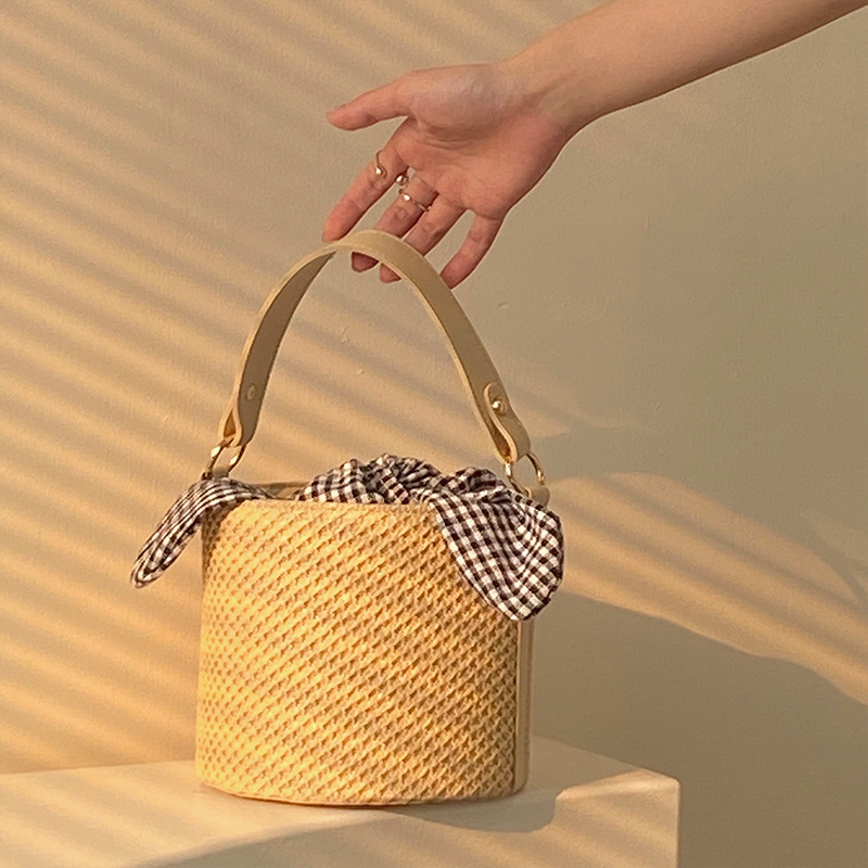 草編水桶包女2025夏季時尚網紅個性打結手提包斜背編織包包女包包