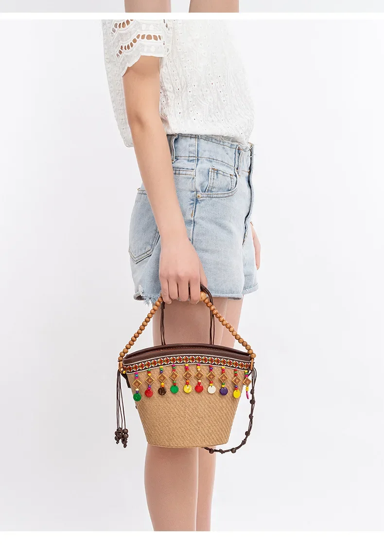 ENSPT拉菲草手工串珠編織包 歐美草編包海邊沙灘度假水桶包女