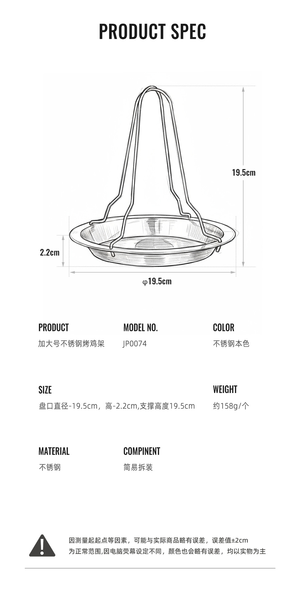 | 規格(長*寬*高) | 盤口φ-19.5cm,盤高2.2cm,支撐高度-19.5cm |