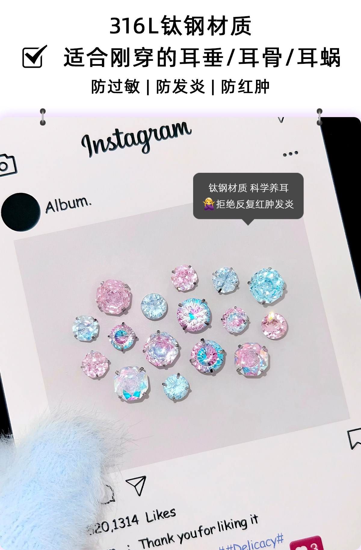 RINGRING商店藍粉色耳釘鈦合金耳骨釘醫用鈦鋼耳蝸釘爆閃華子耳飾