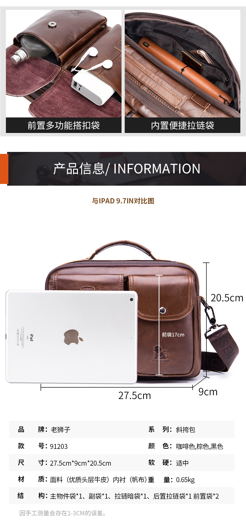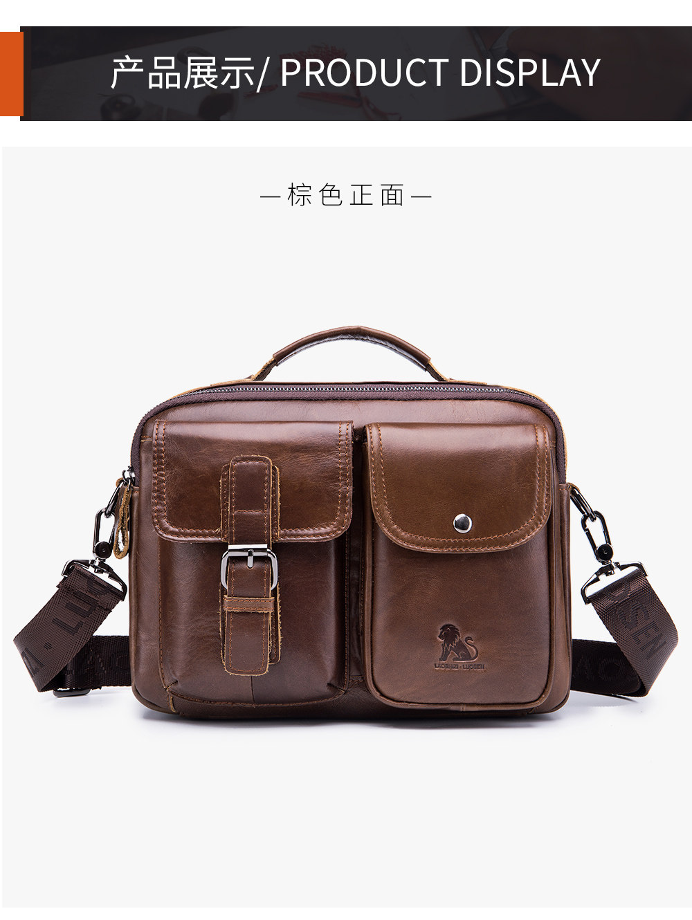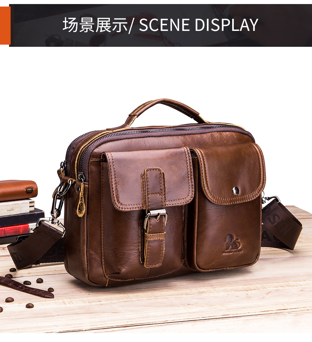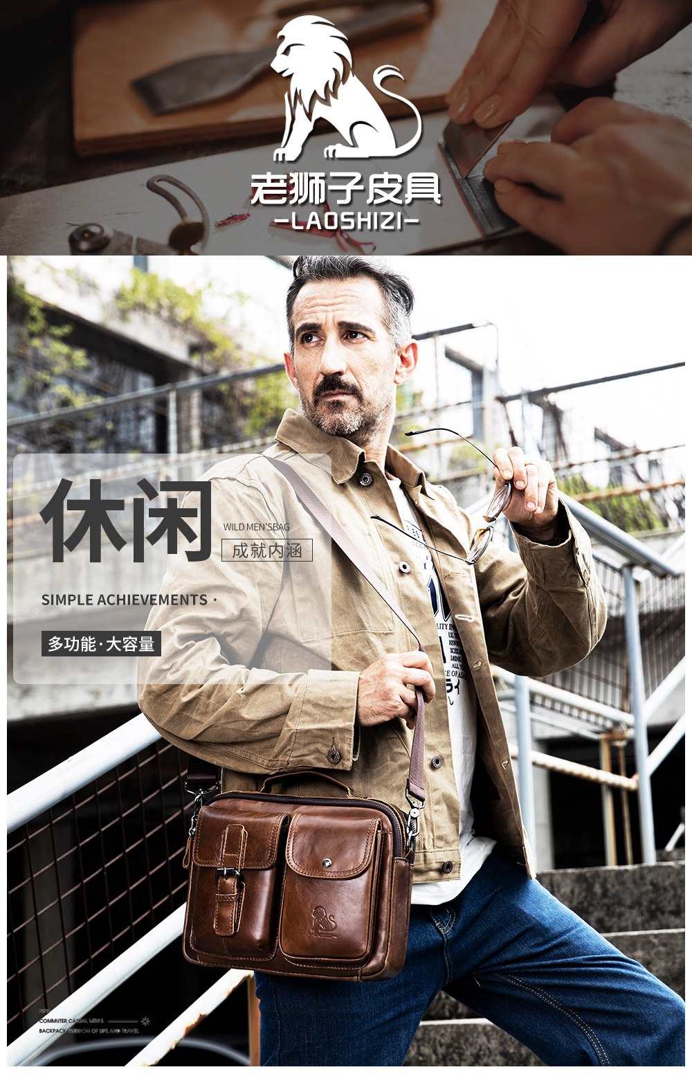 老獅子牛皮男士斜後後背包 復古休閒單肩包男 男款頭層牛皮迷你小挎包