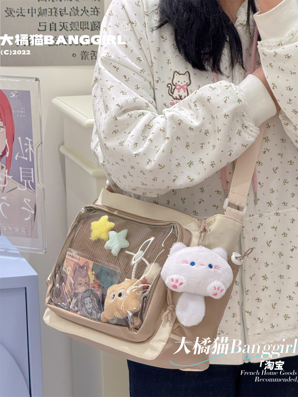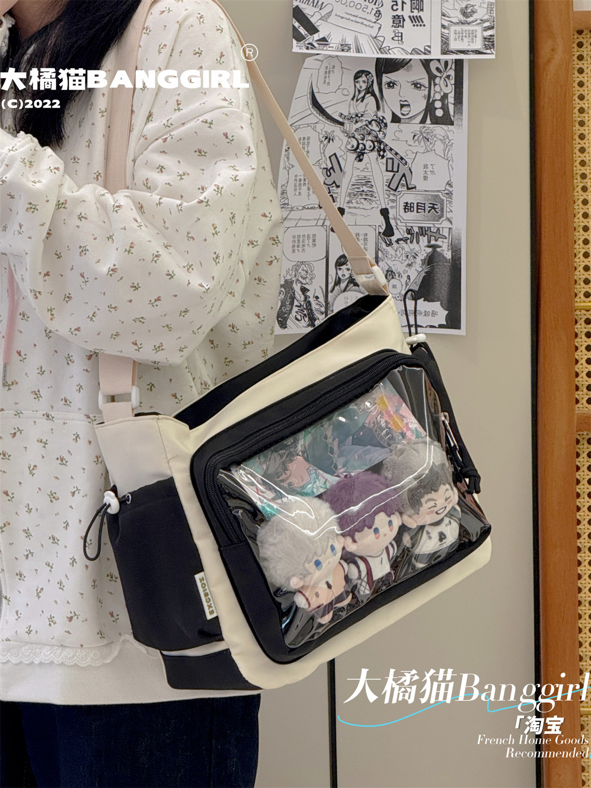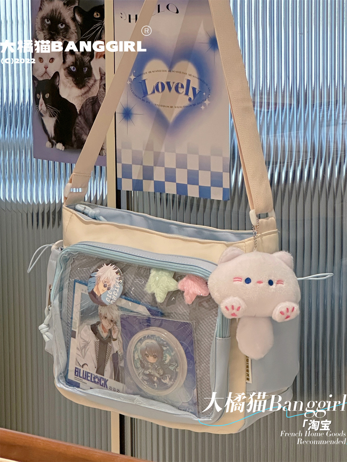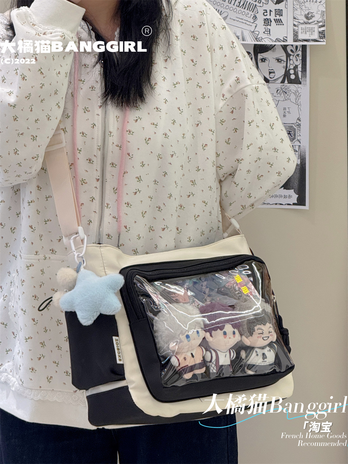 大橘貓學院風百搭撞色大容量郵差包女透明吧唧單肩包斜背娃包痛包