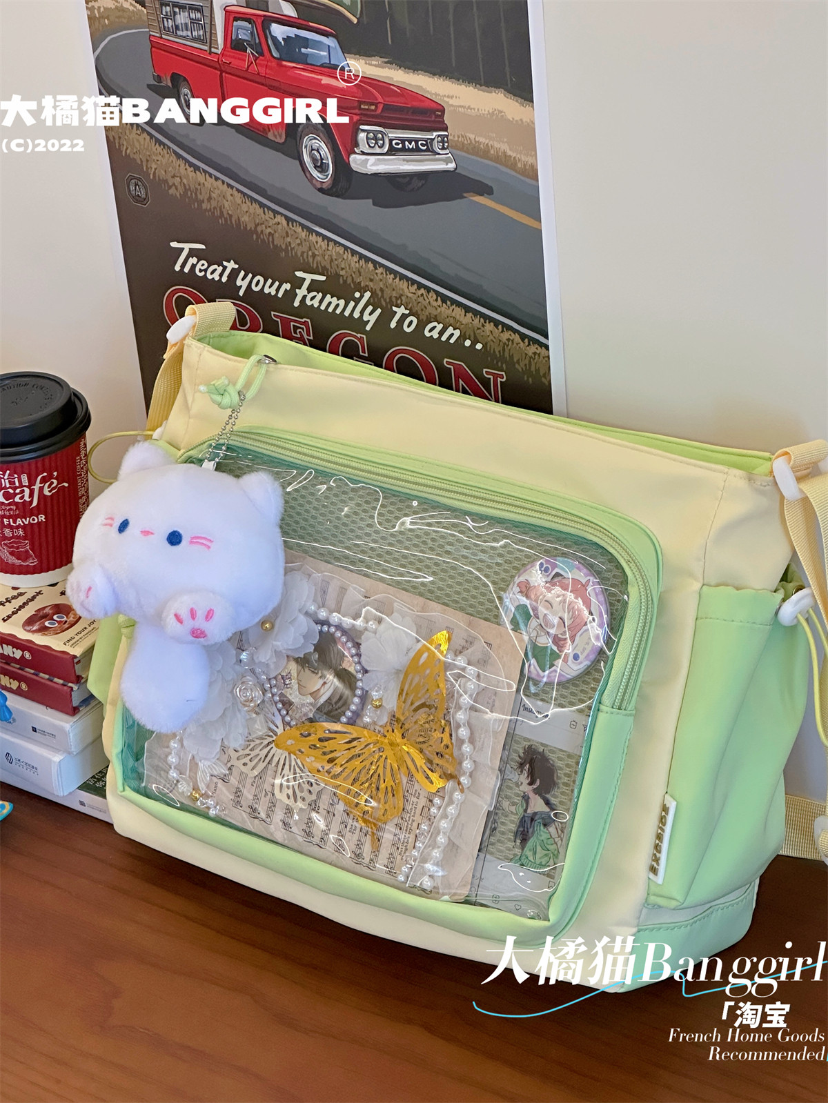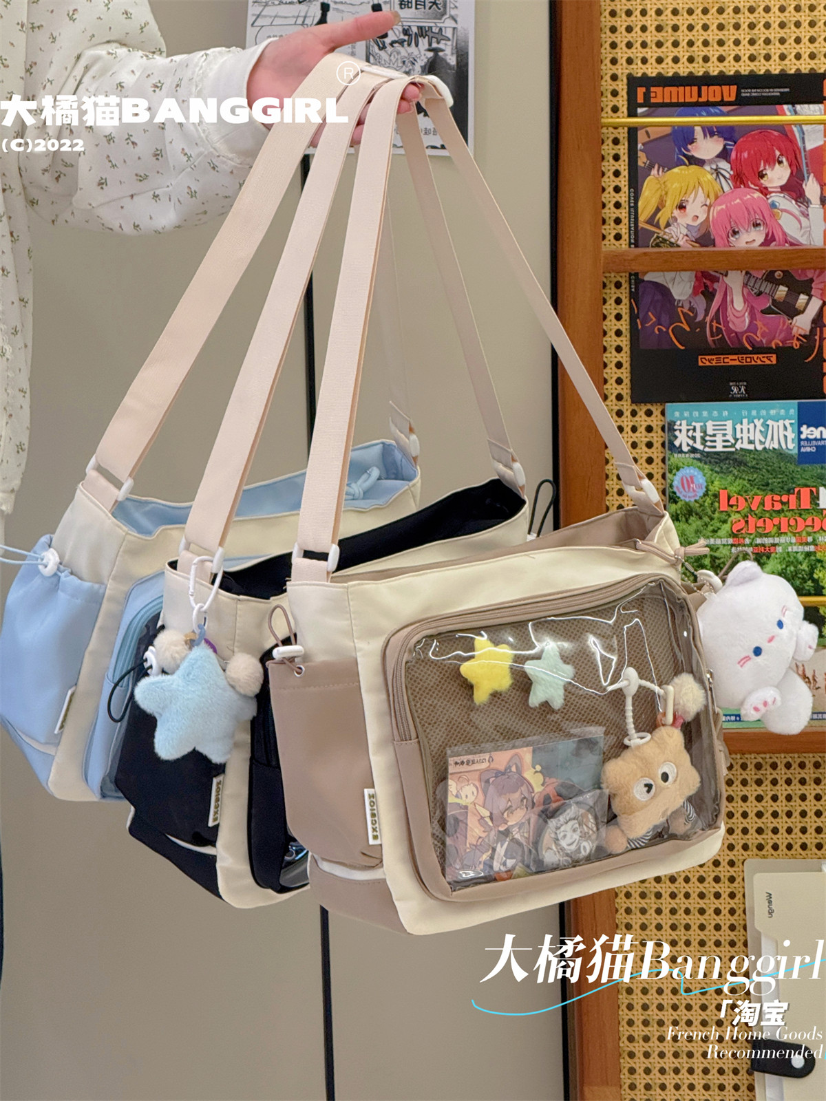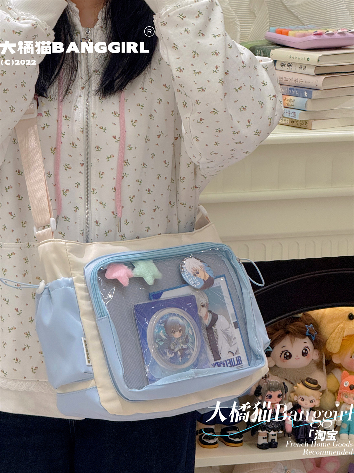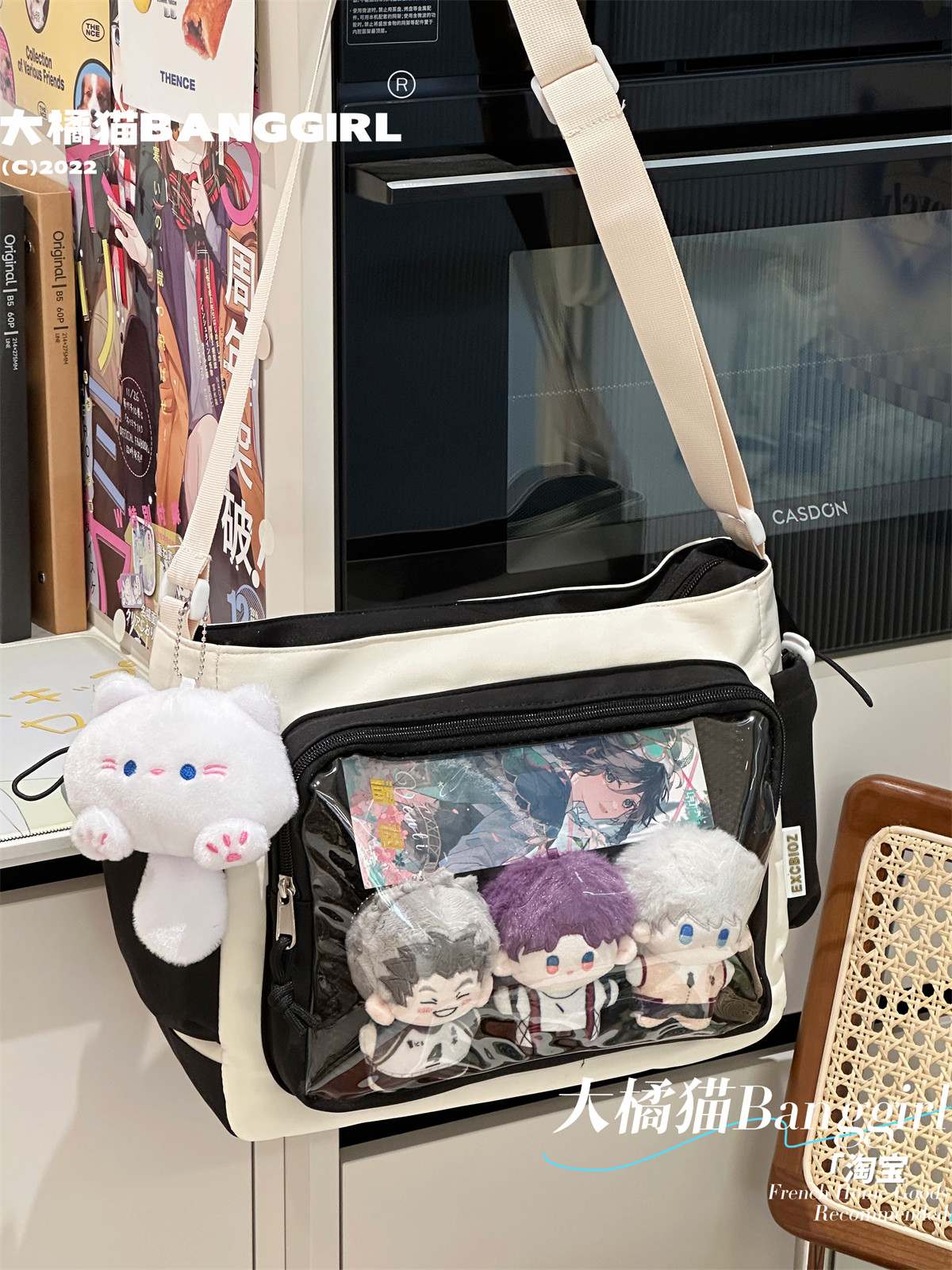 大橘貓學院風百搭撞色大容量郵差包女透明吧唧單肩包斜背娃包痛包