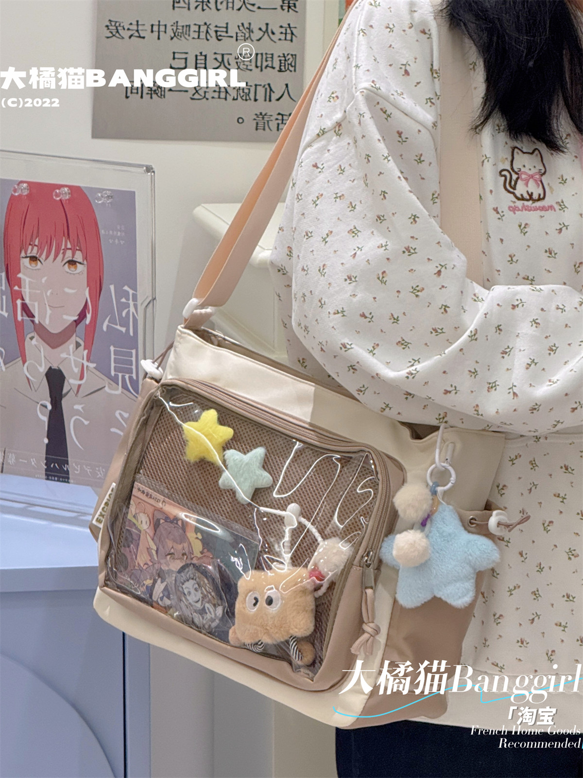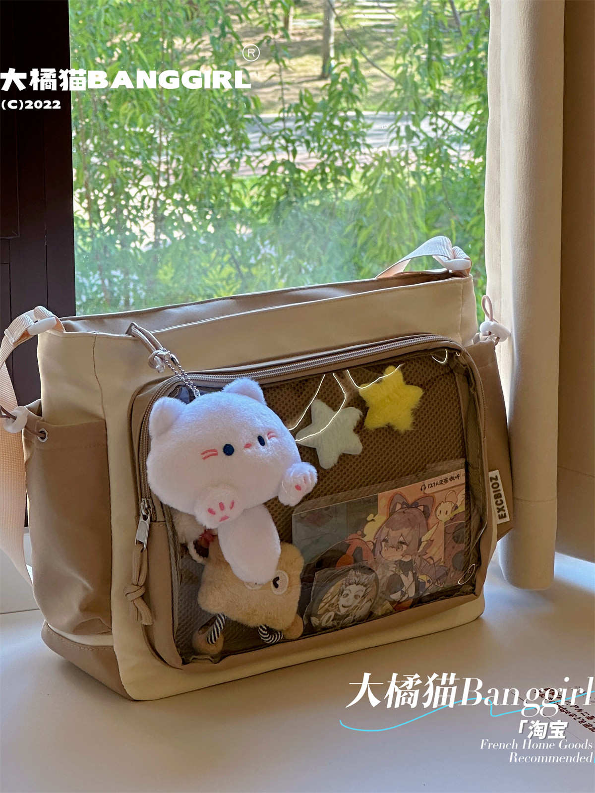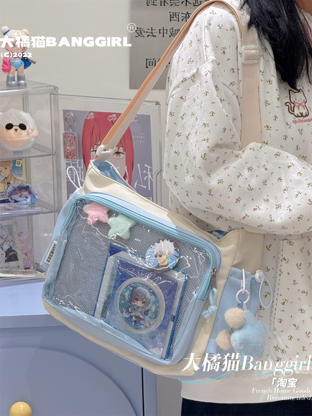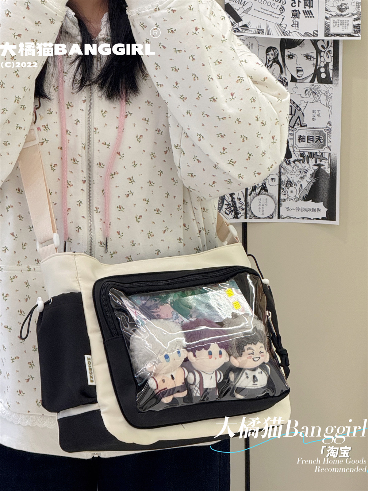 大橘貓學院風百搭撞色大容量郵差包女透明吧唧單肩包斜背娃包痛包