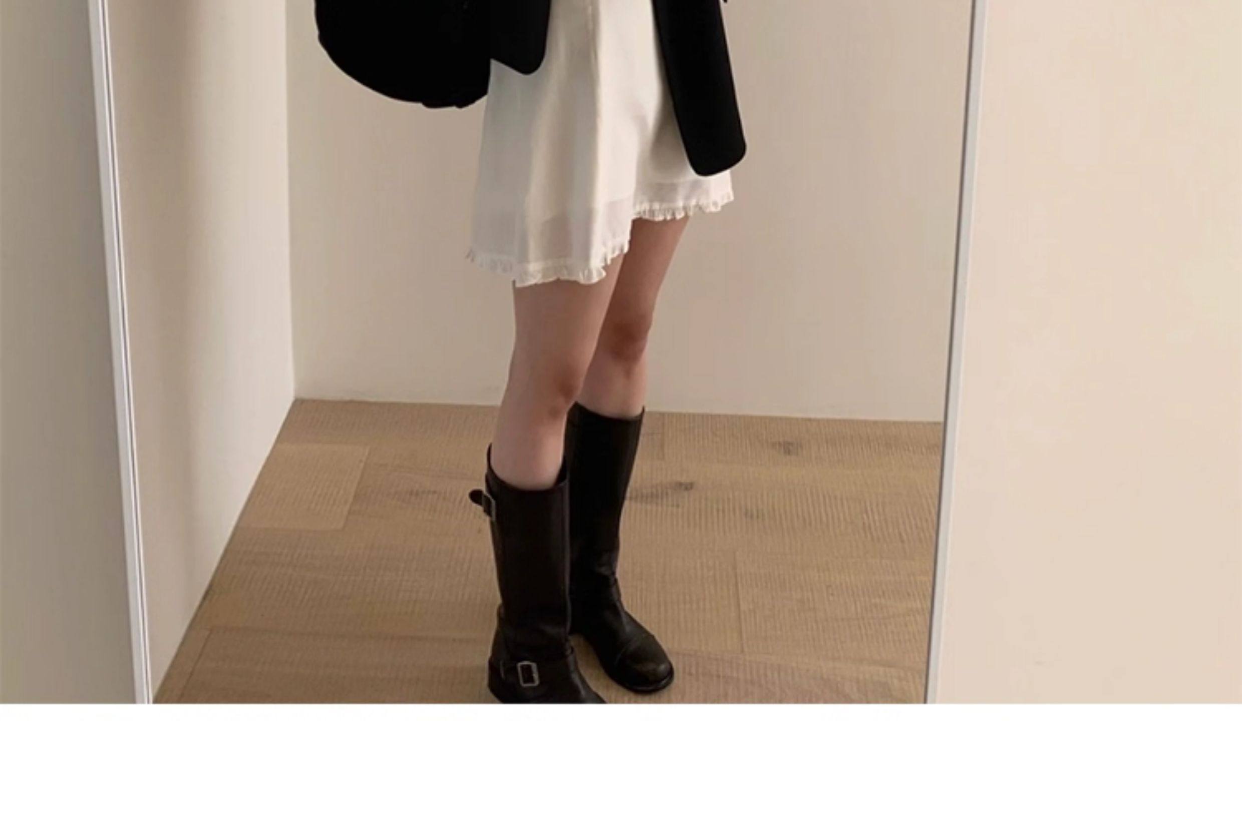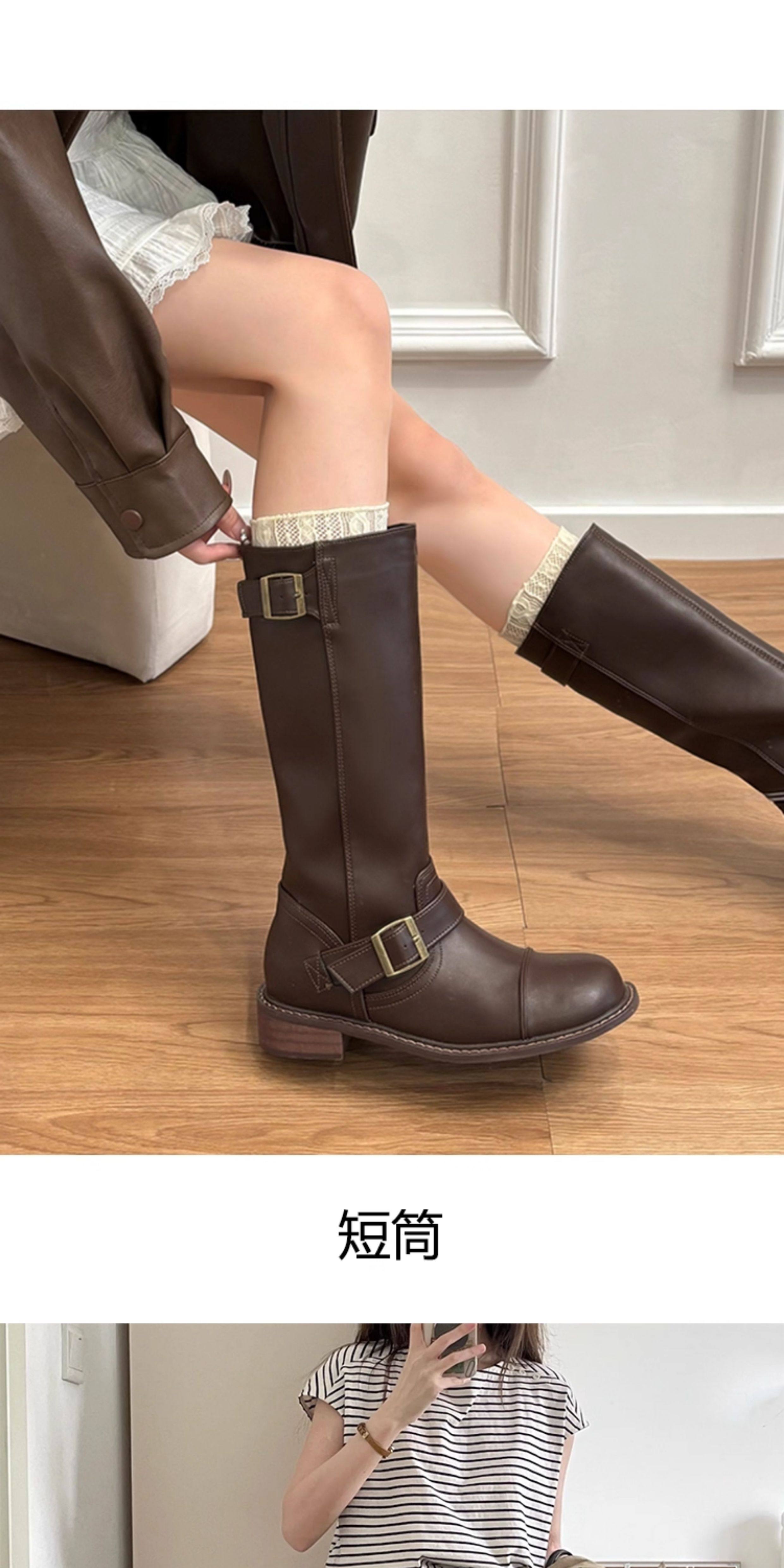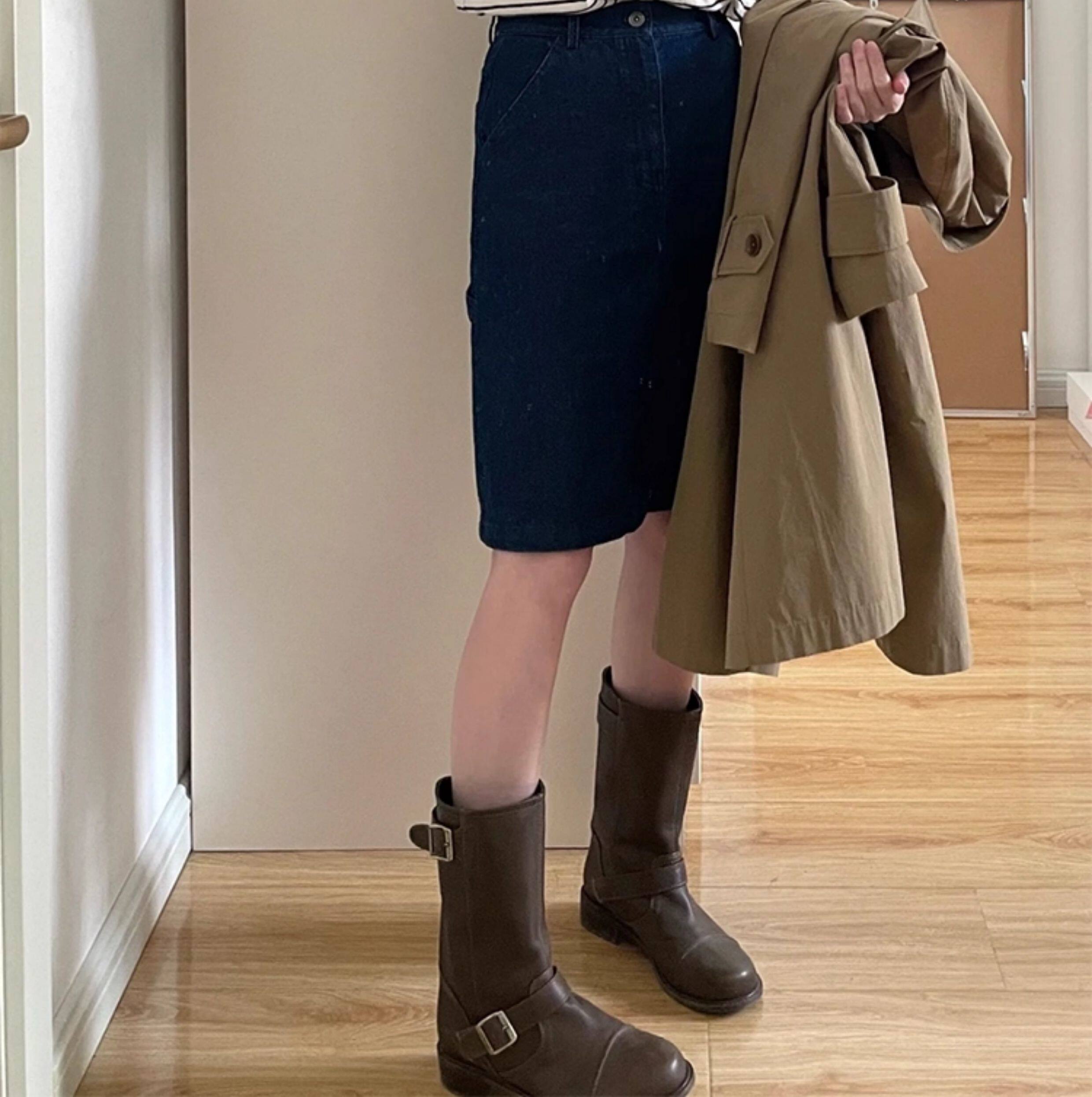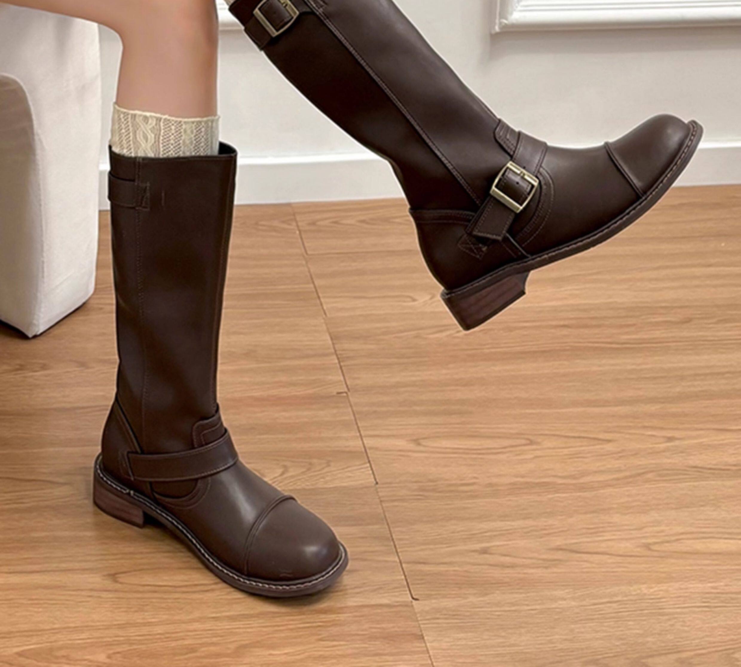 牛皮版~真皮英倫風厚底皮帶釦寬筒中筒機車靴騎士靴女馬丁靴長靴
