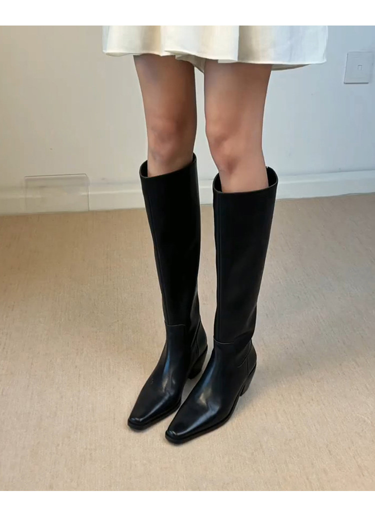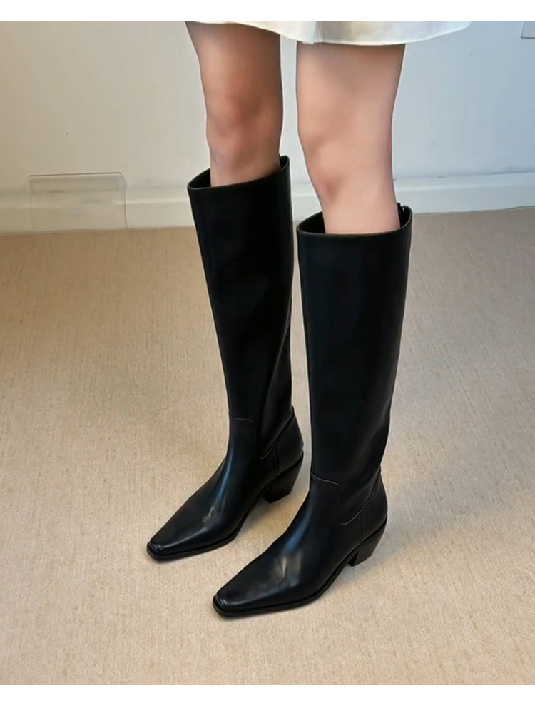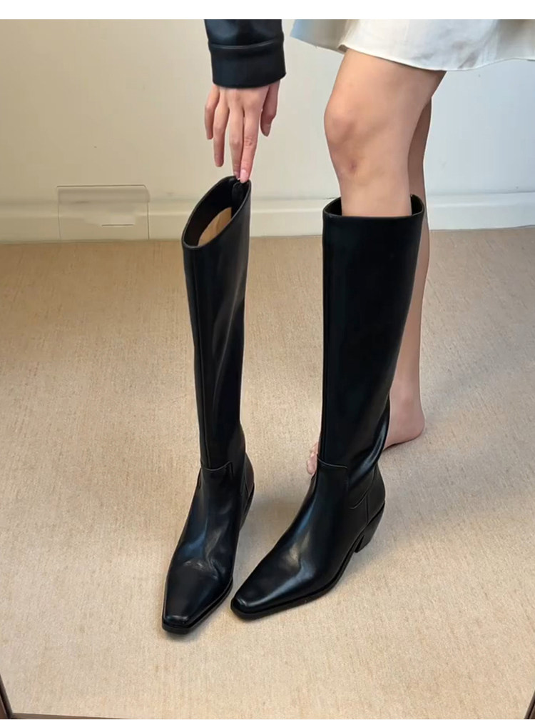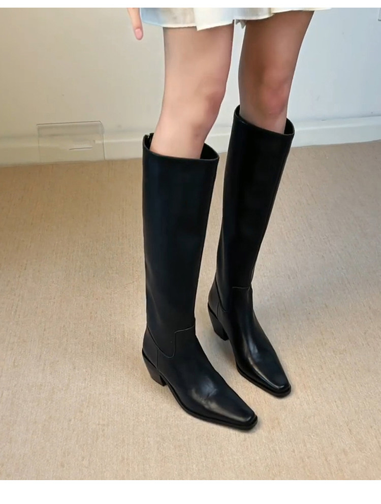 牛皮版~法式帥氣方頭不過膝騎士靴女側拉鍊粗跟簡約真皮瘦瘦靴子