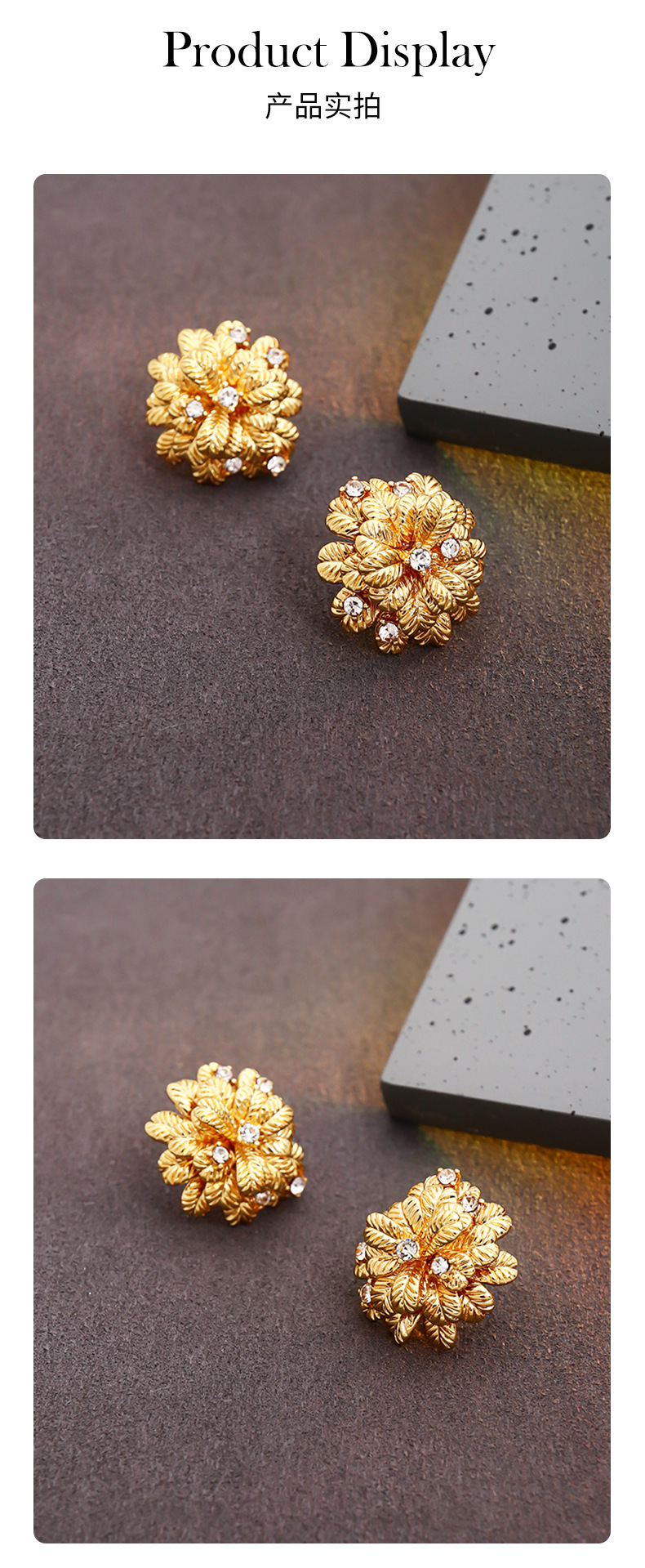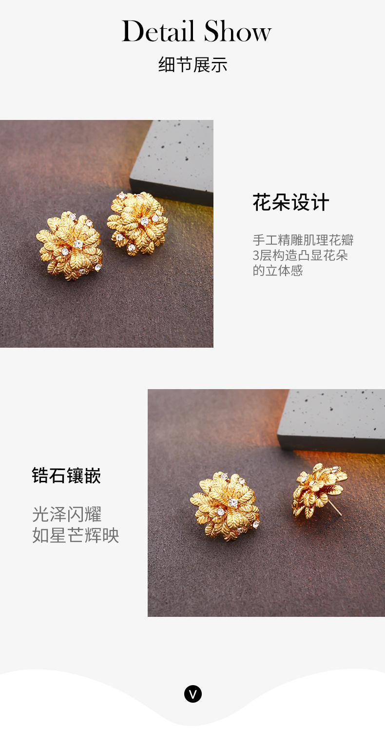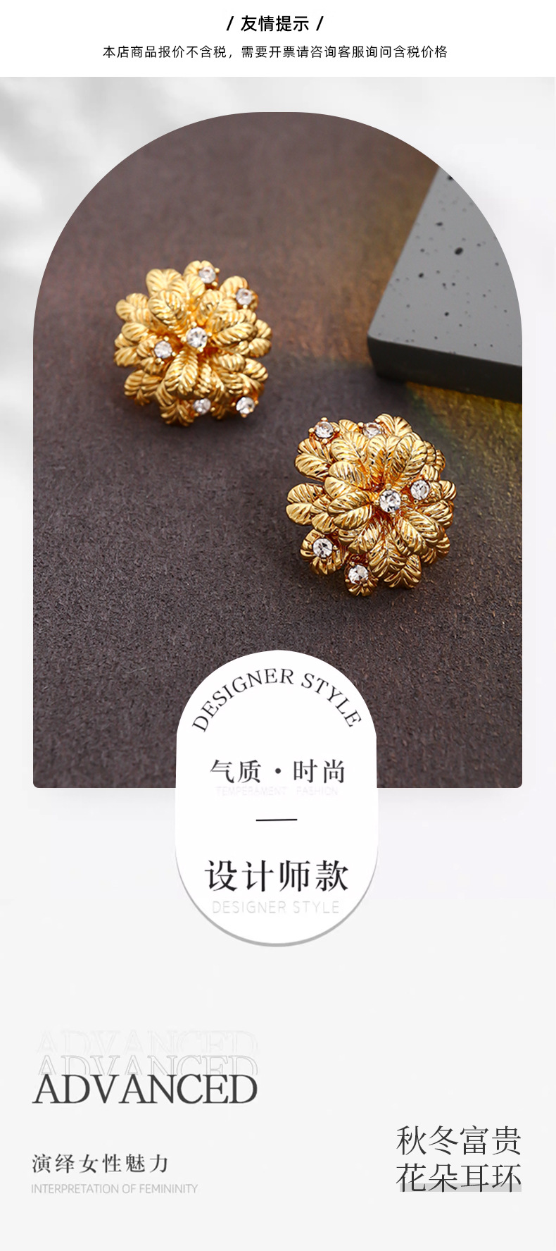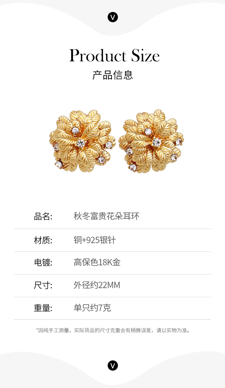 高級金屬感鑲鑽富貴花朵925銀針耳釘高保色18K金電鍍時尚氣質耳環