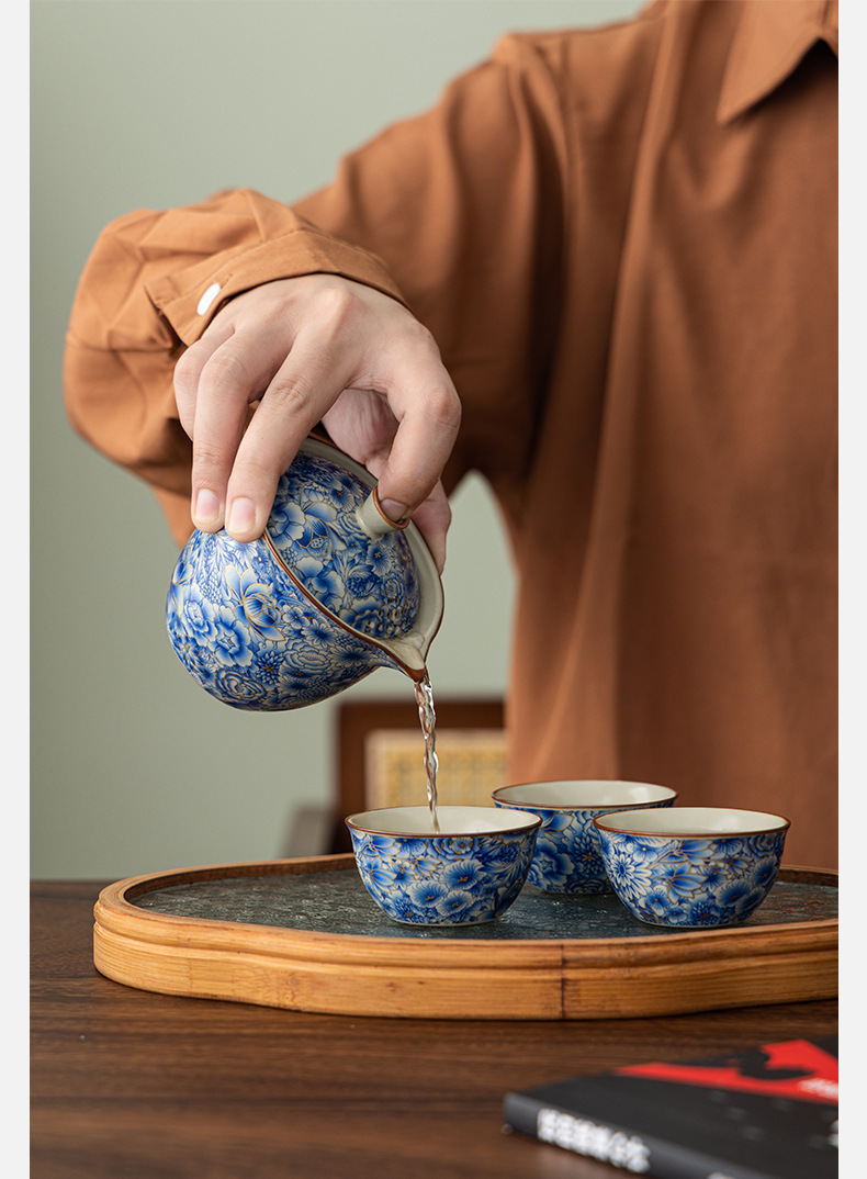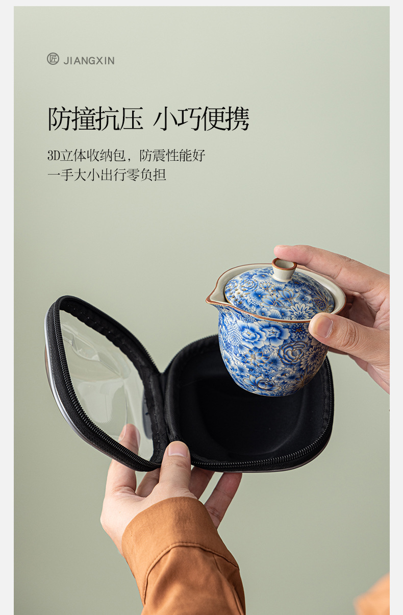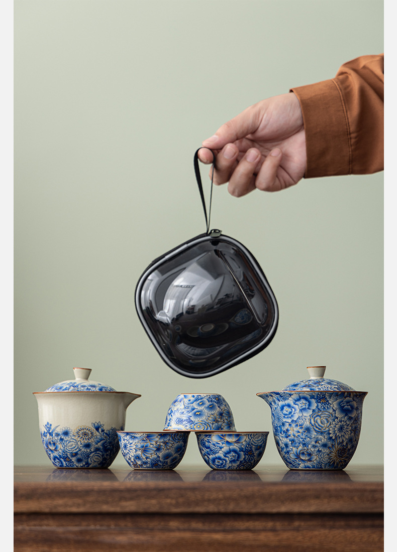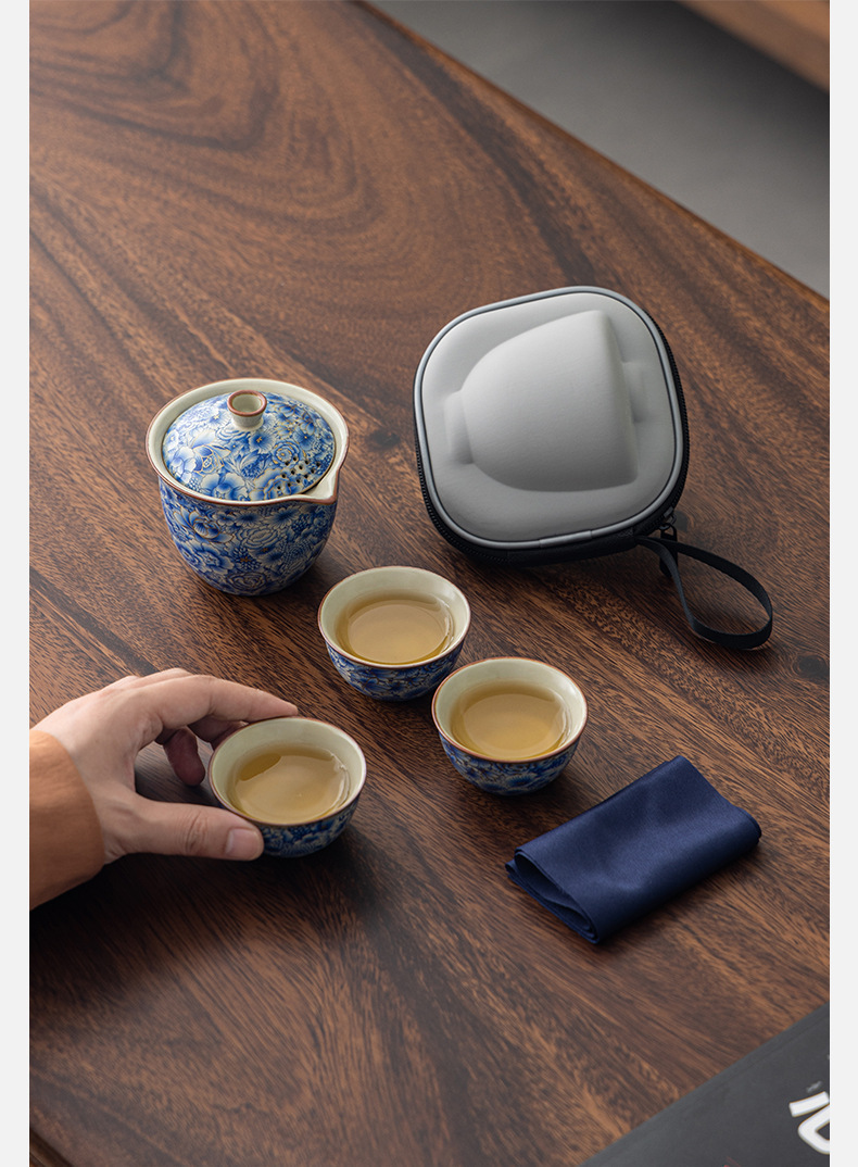 汝窰青花旅行茶具戶外喝茶快客杯可攜式旅行包一壺三杯泡茶壺套裝