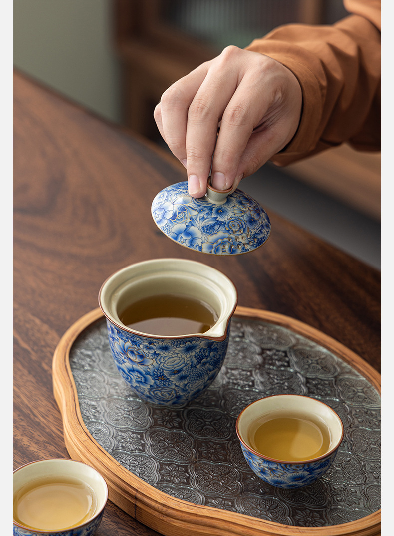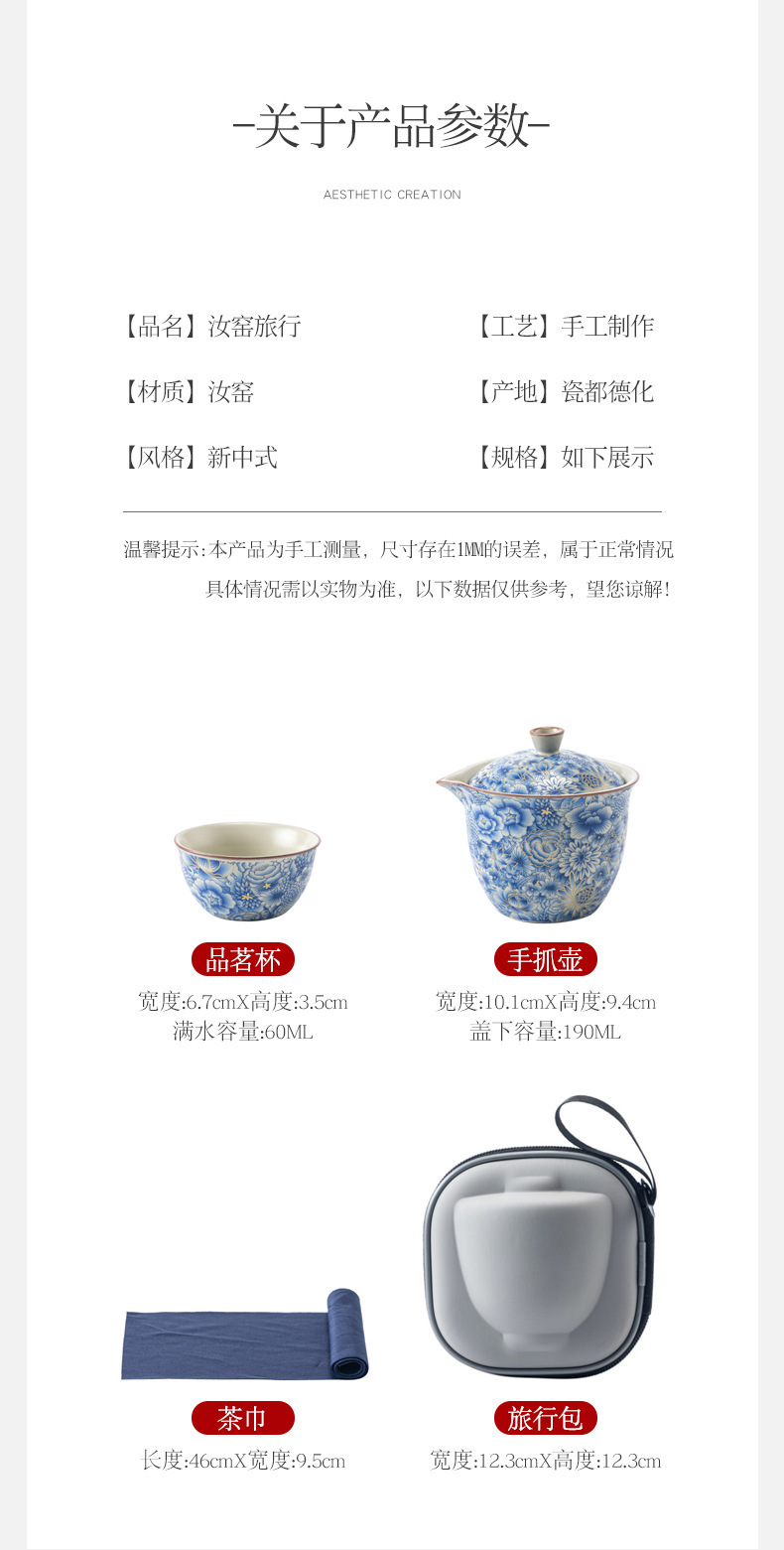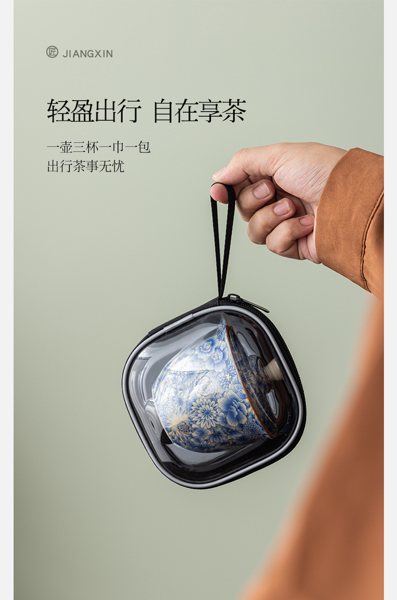 汝窰青花旅行茶具戶外喝茶快客杯可攜式旅行包一壺三杯泡茶壺套裝