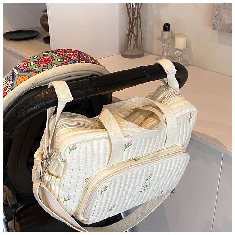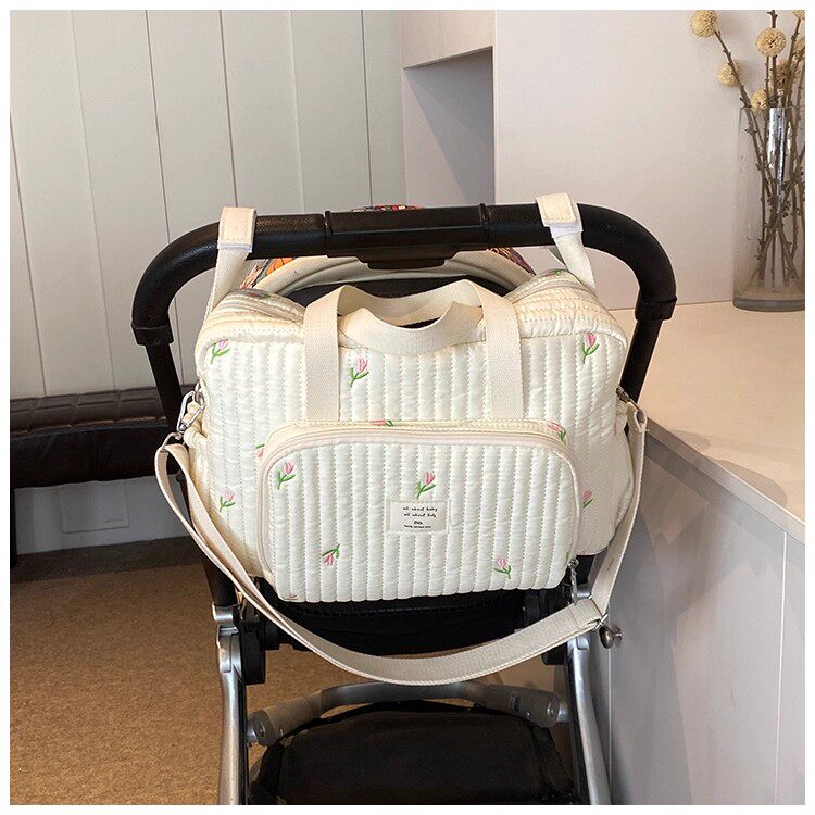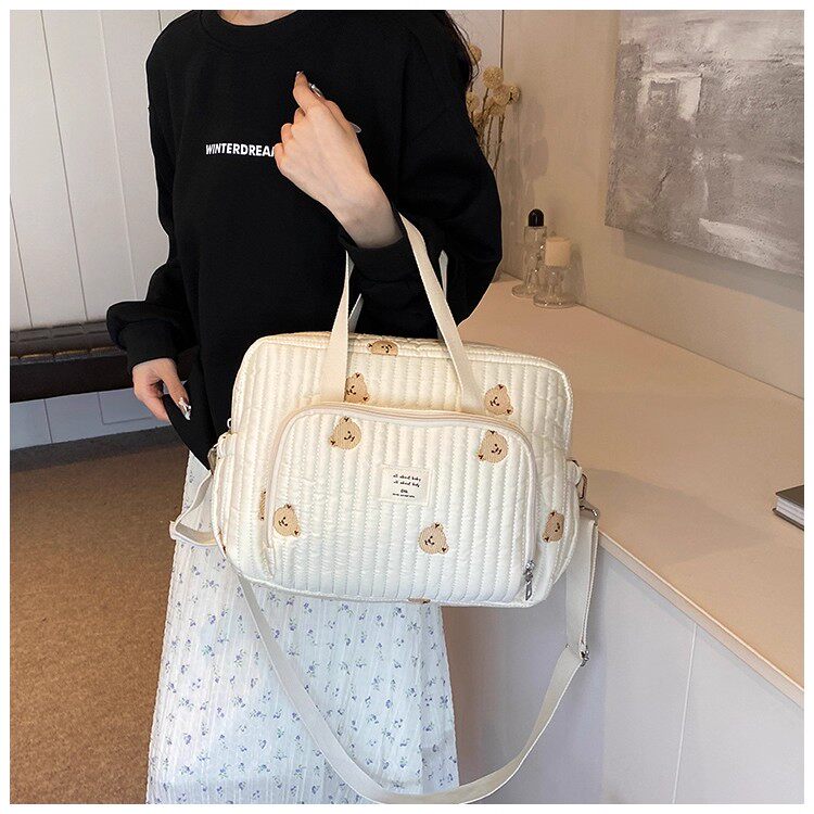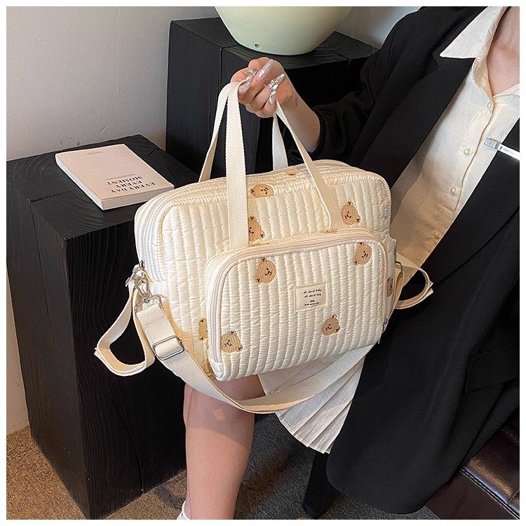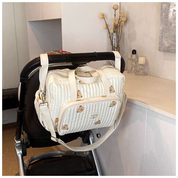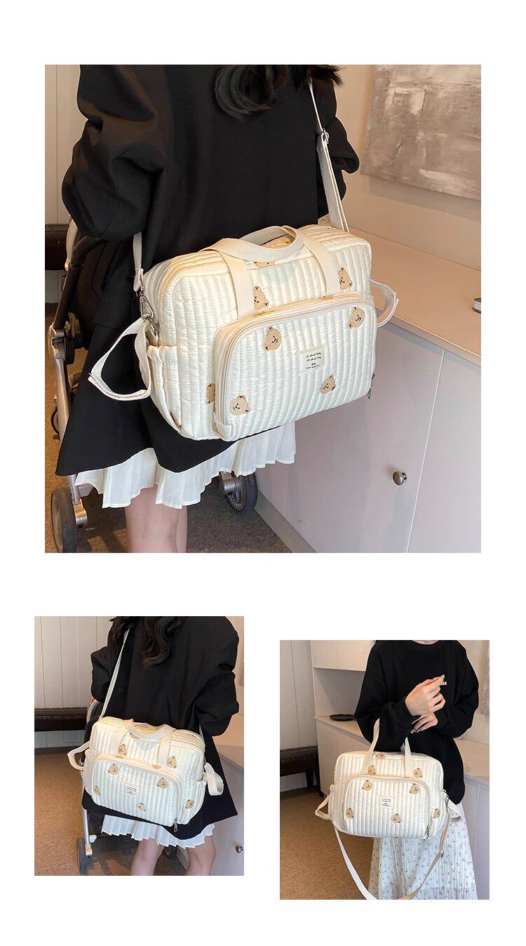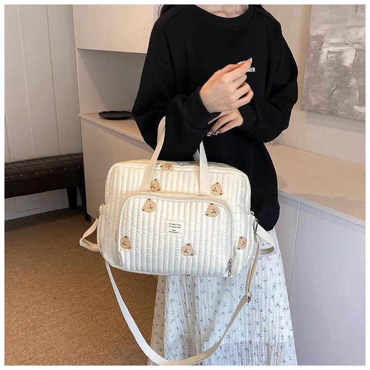 韓國ins小熊媽咪包時尚刺綉花朵手提包大容量母嬰外出遛娃旅行包