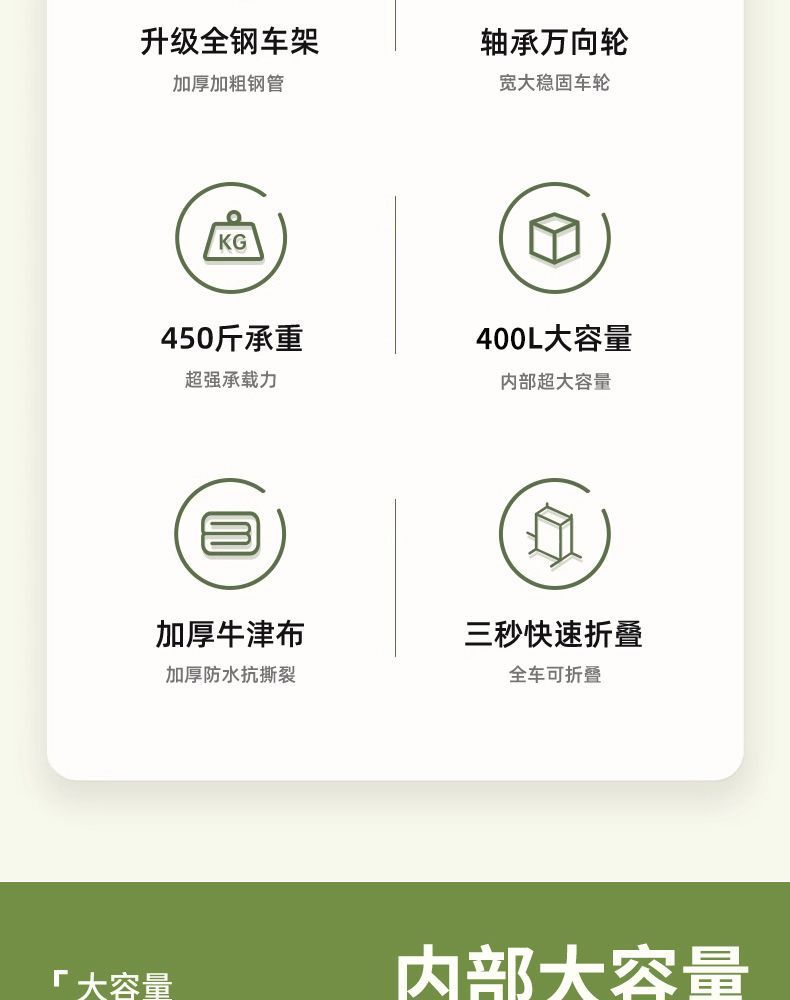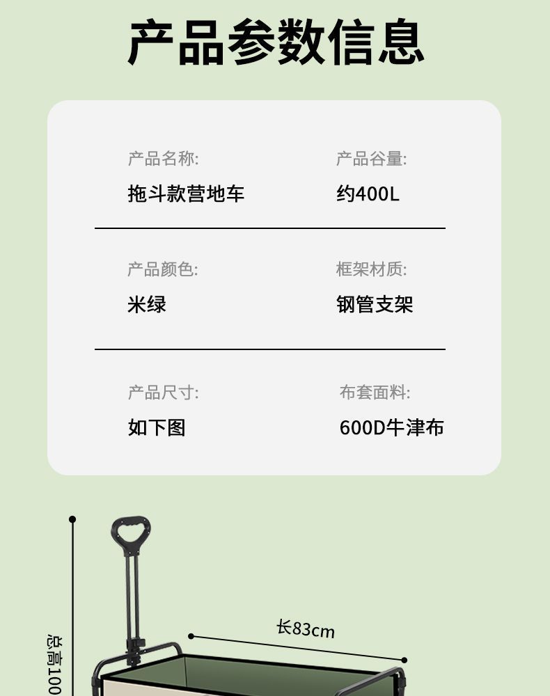 | 顔色 | 營地車+加高加長二用折曡桌+遮陽傘-8寸越野輪米綠/無刹車 |