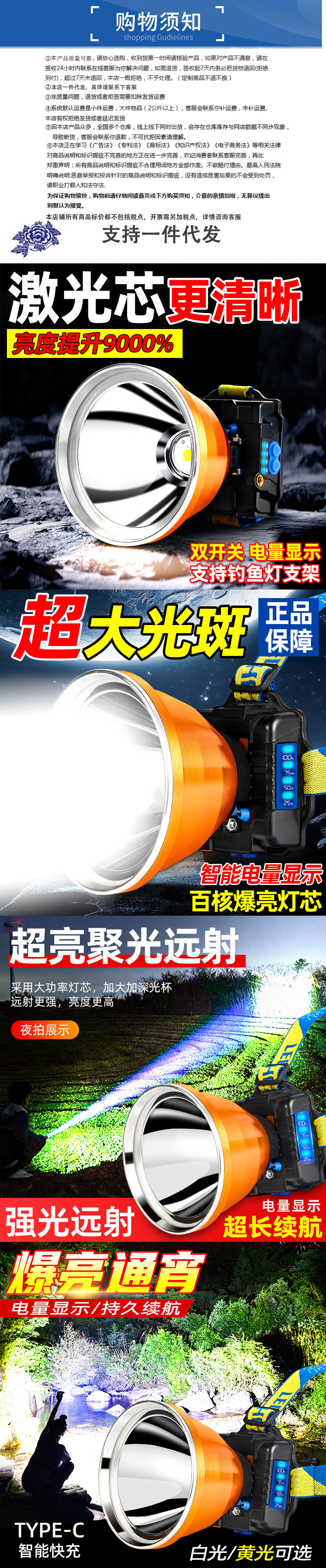 | 顔色 | 抓魚穿透【黃光】通宵續航+電量顯示-【力薦】三鋰電超爆亮十代雷射燈芯99999K |