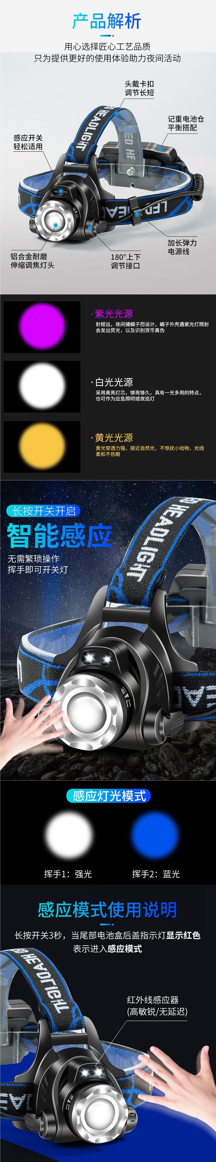 | 顔色 | 旗艦款【白+紫雙光】四電一充感應頭燈 |