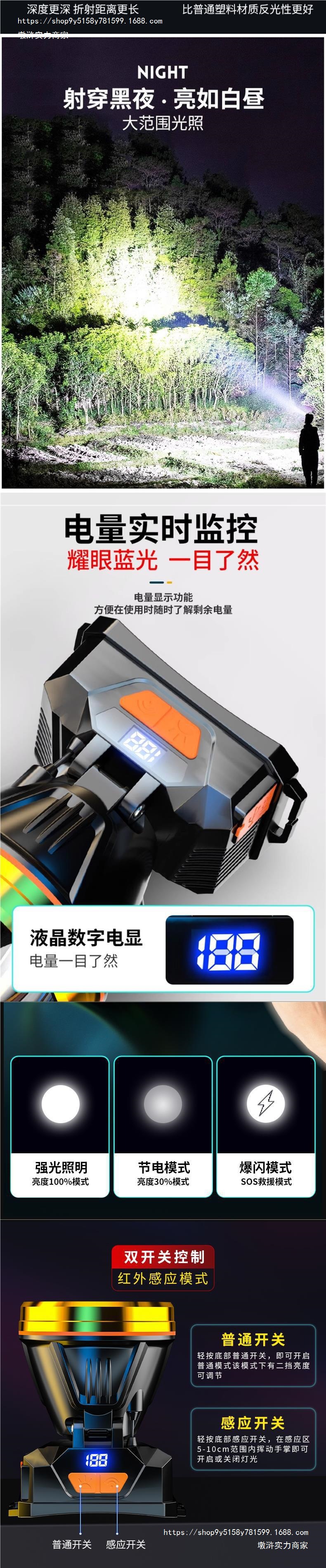 | 顔色 | 雙鋰電99800W黃光【600小時】數顯+帶感應+帶輸出【更大光斑】 配用頭繩+數據線 |