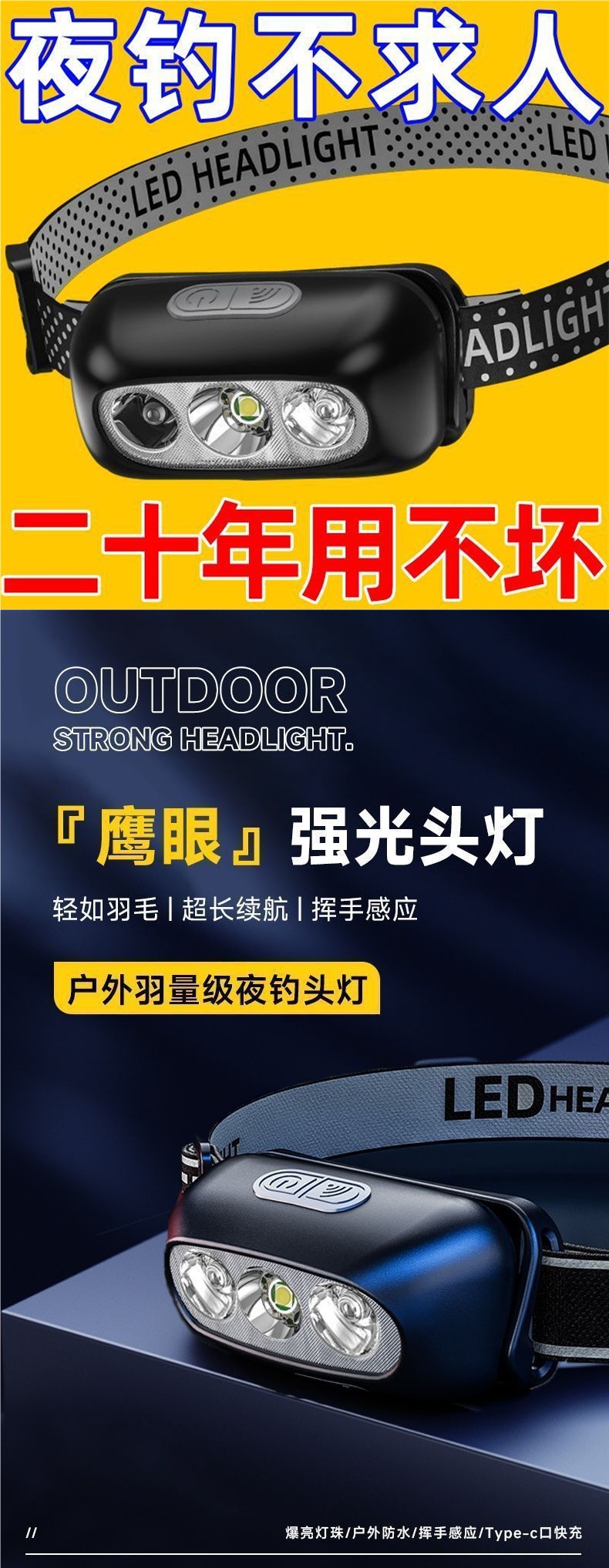 頭燈超亮可充電頭戴式強光感應特亮手電筒小型可攜式夜釣魚燈
