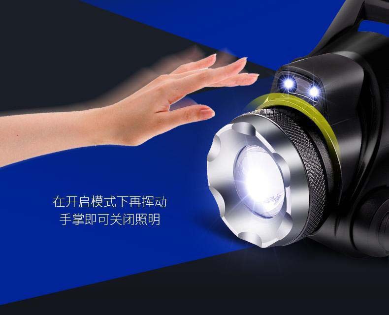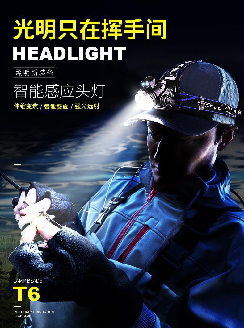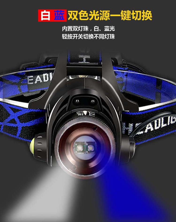 釣魚燈夜釣藍白雙光源感應頭燈 充電防水變焦頭戴式電筒照明燈