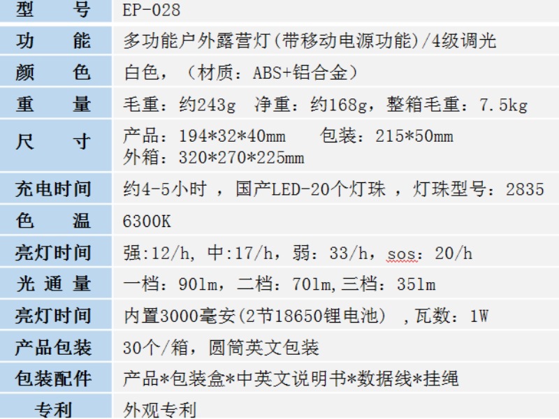 | 貨號 | 戶外露營燈/EP-028 |