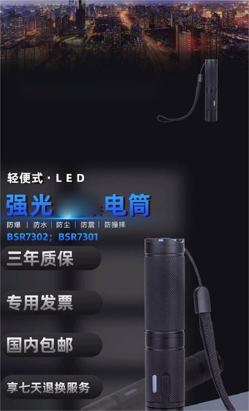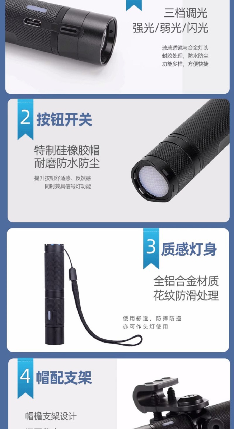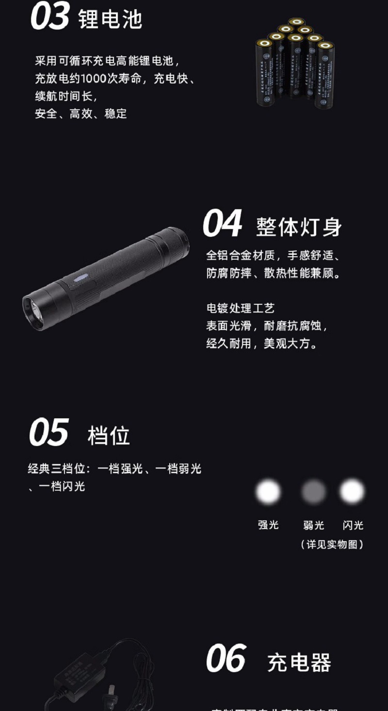 7、燈具具有強光、工作光、頻閃光三檔光,採用輕觸式開關。