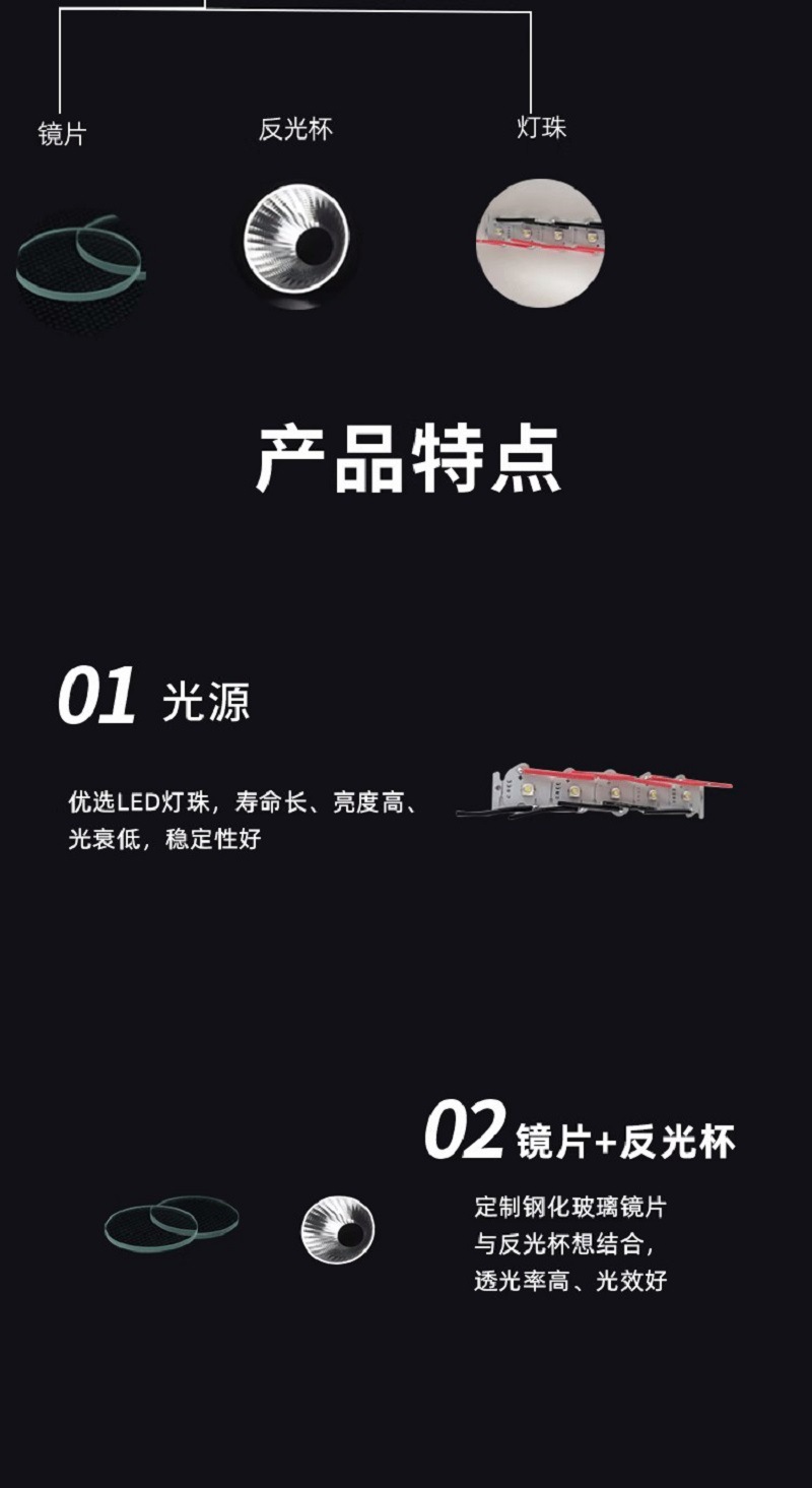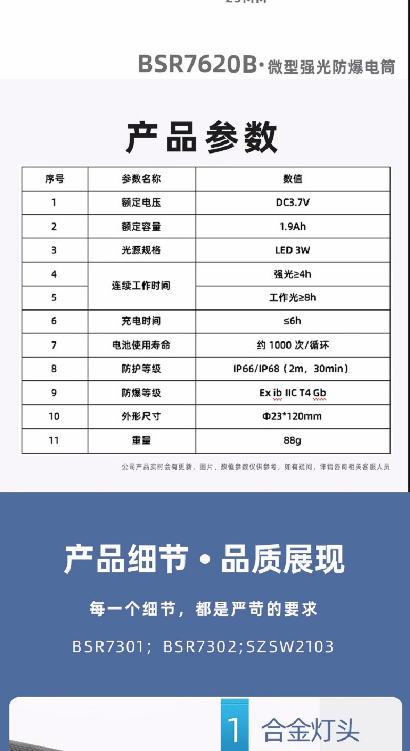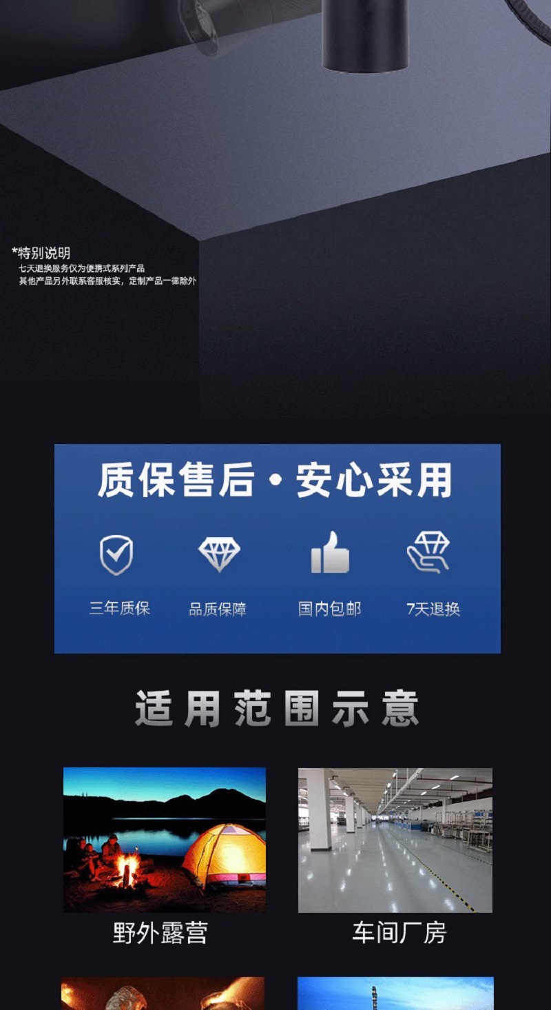 7、燈具具有強光、工作光、頻閃光三檔光,採用輕觸式開關。
