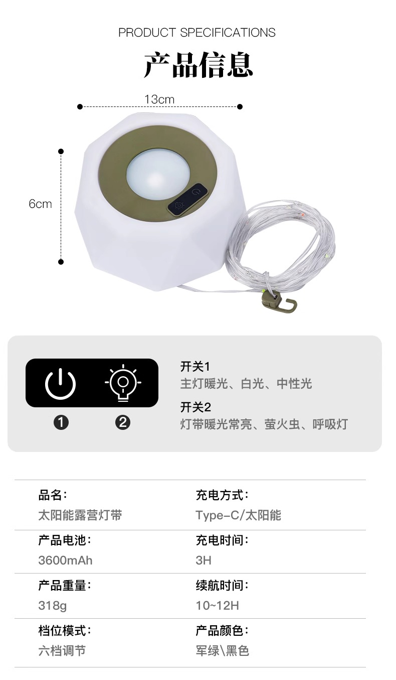 | 顔色 | 綠色【可太陽能充電+15米暖光燈帶】 可對手機充電 |