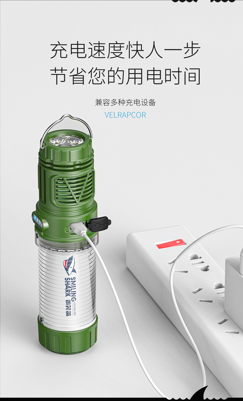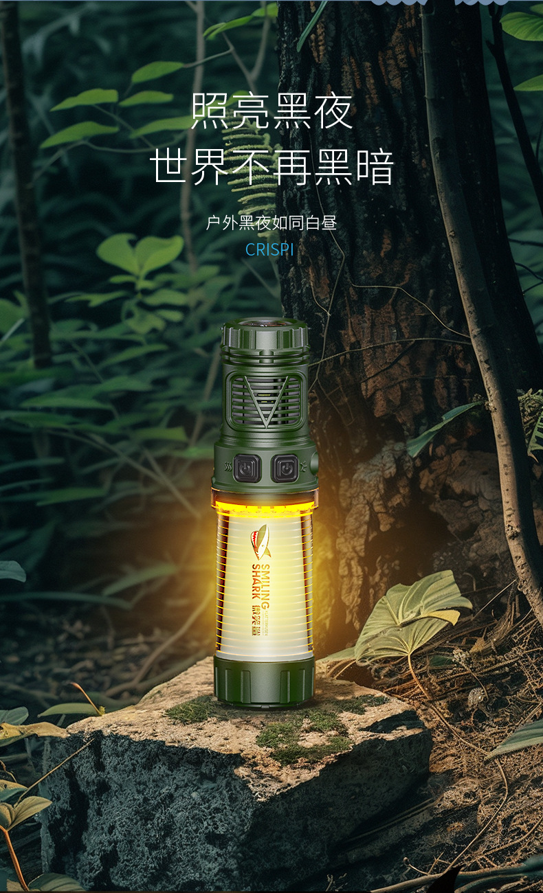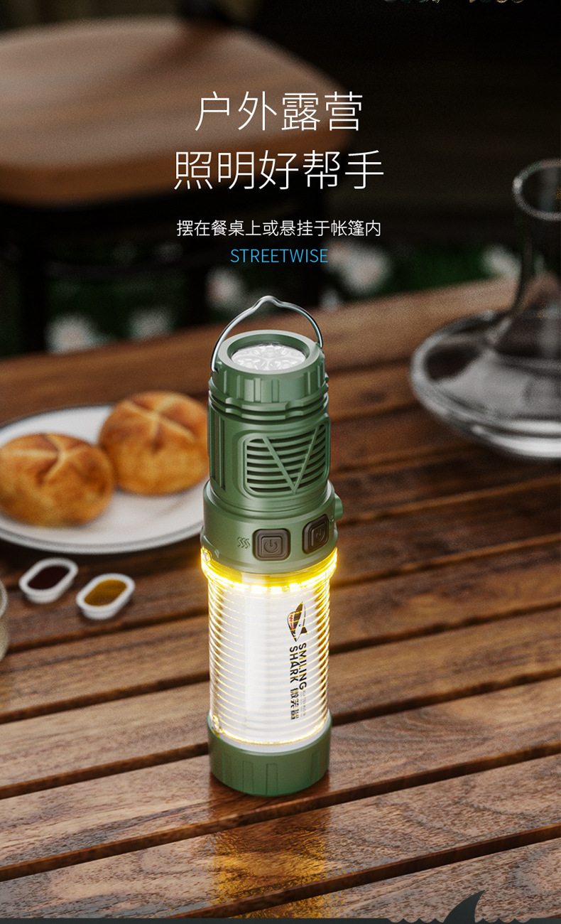 微笑鯊帶驅蚊功能可充電磁吸掛鉤戶外黃白雙光多功能露營燈支架燈