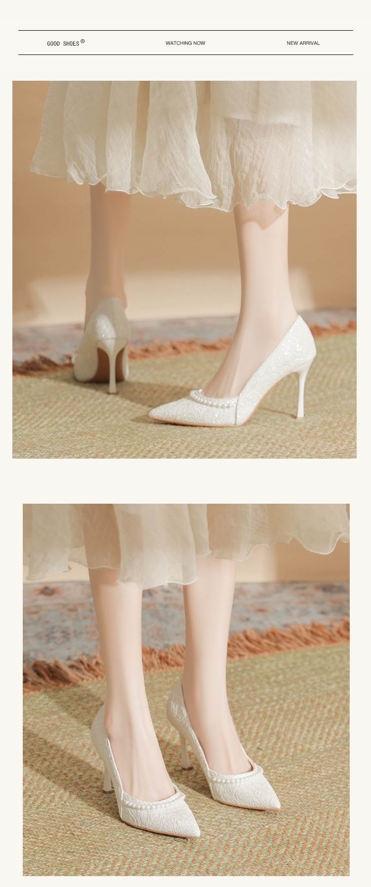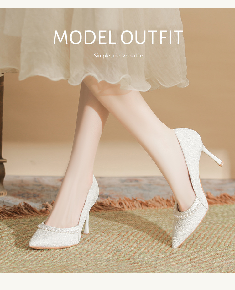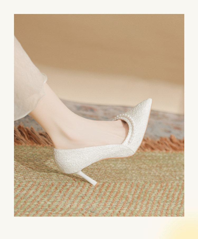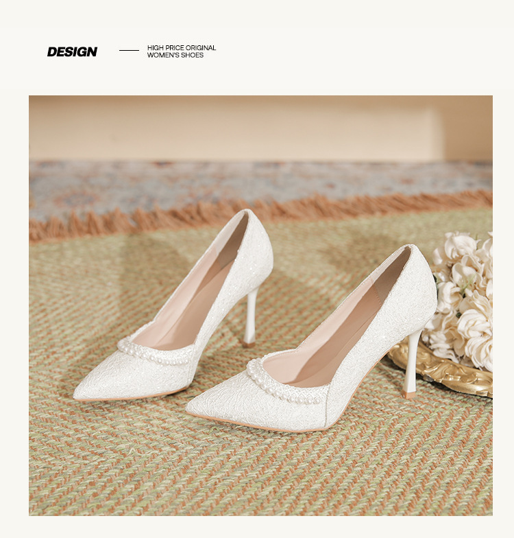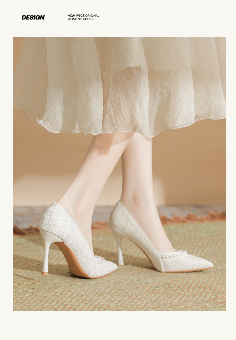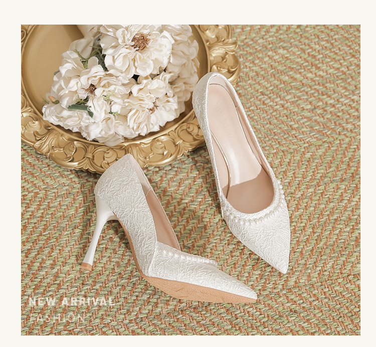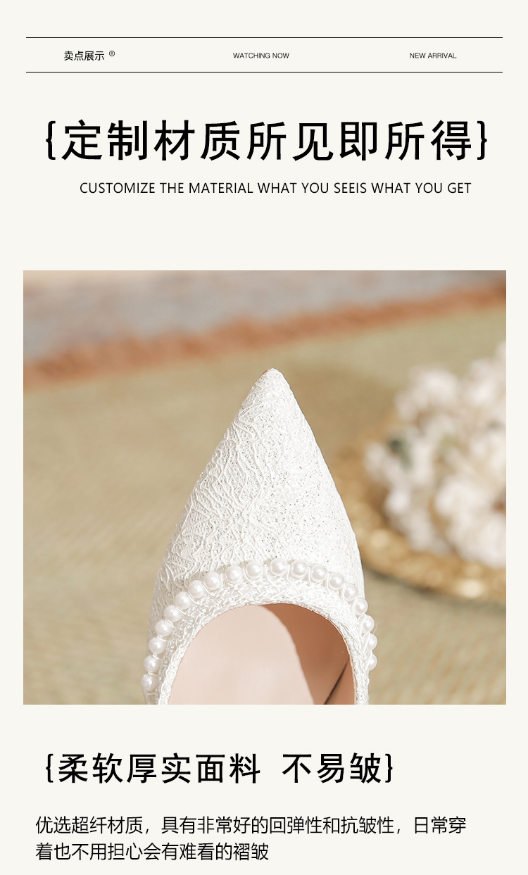 新款珍珠飾釦蕾絲面高跟鞋女細跟尖頭新娘伴娘純色大碼婚禮結婚鞋