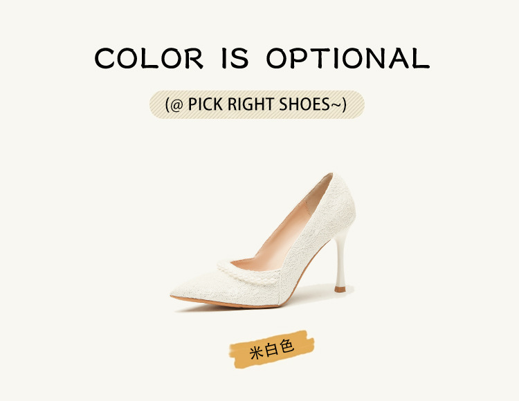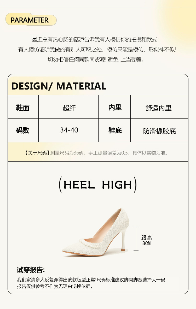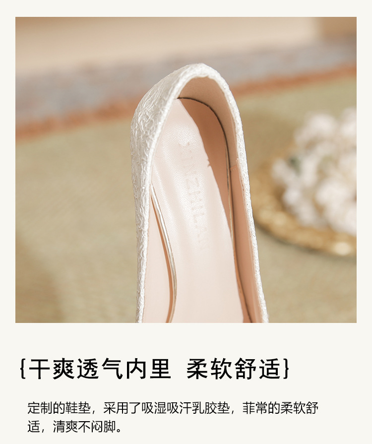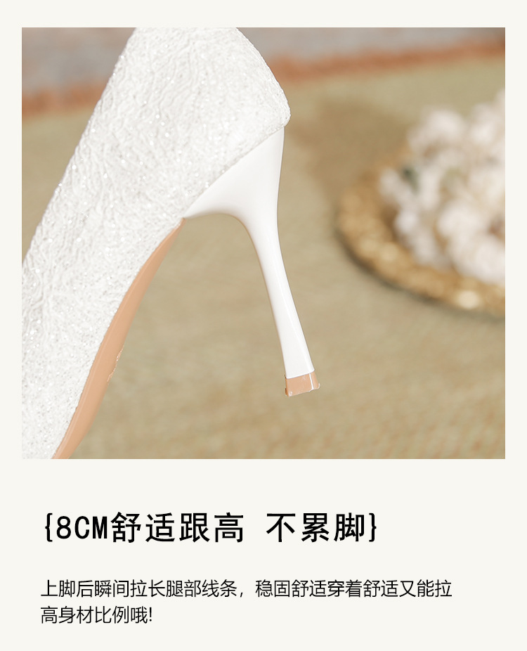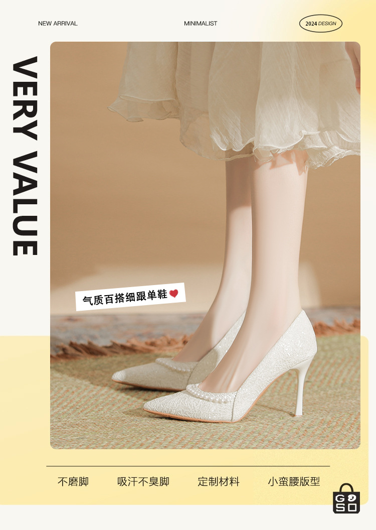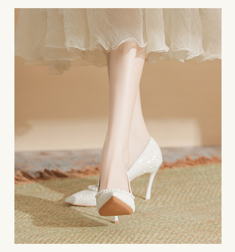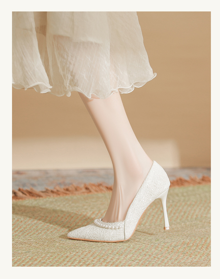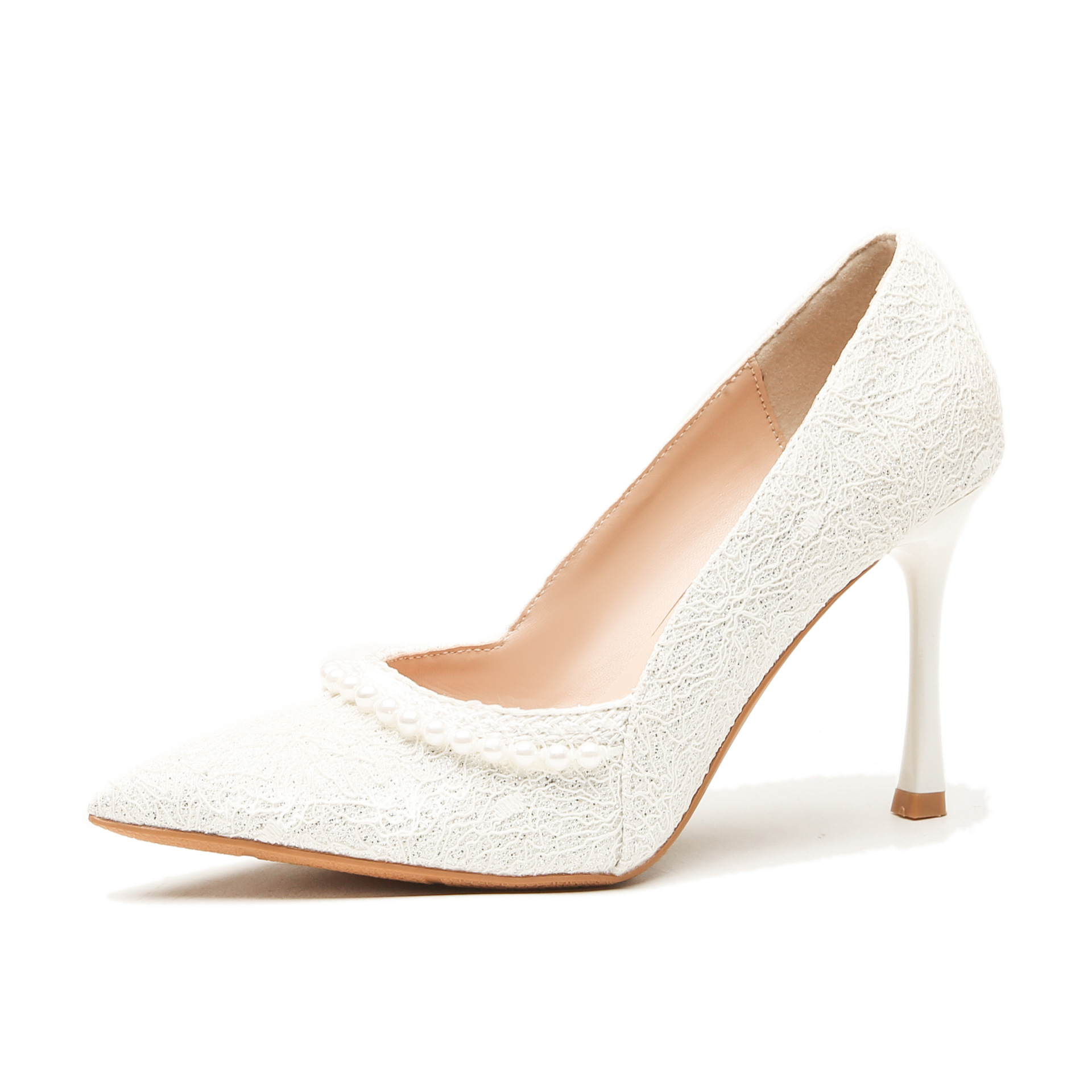 新款珍珠飾釦蕾絲面高跟鞋女細跟尖頭新娘伴娘純色大碼婚禮結婚鞋