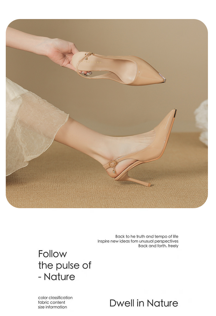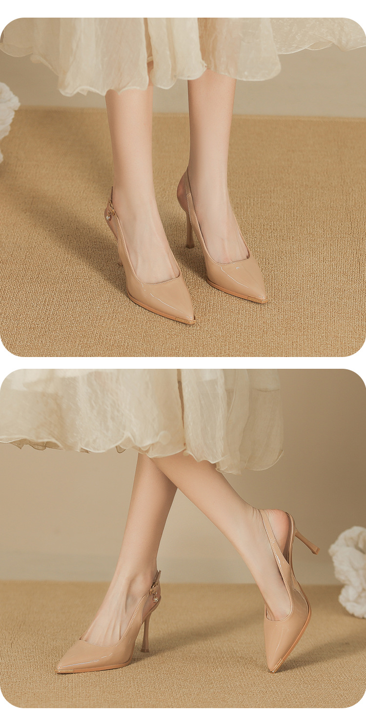 黑色漆皮後空金屬頭防踢碰細跟淺口尖頭不掉跟氣質百搭通勤單鞋女