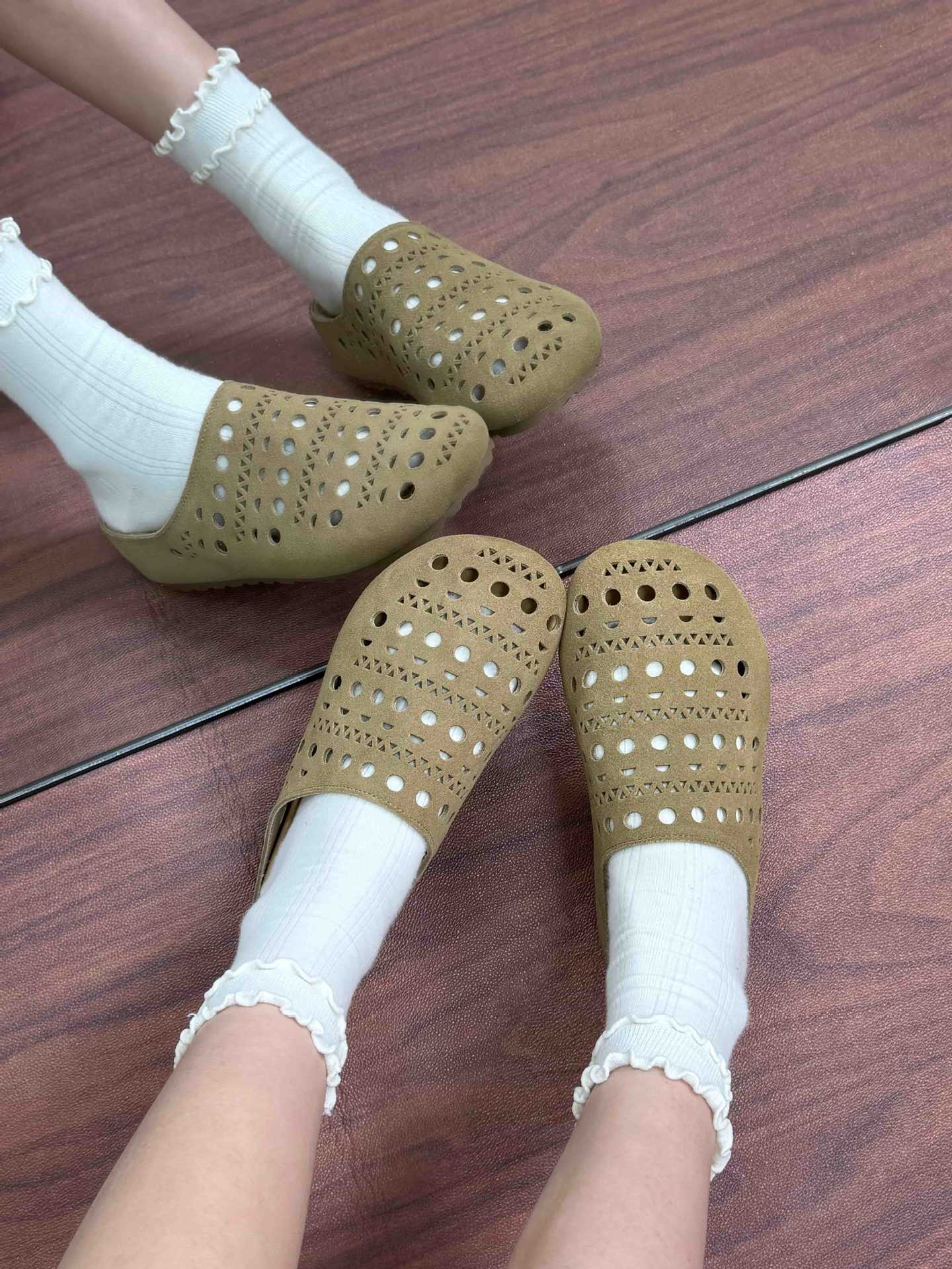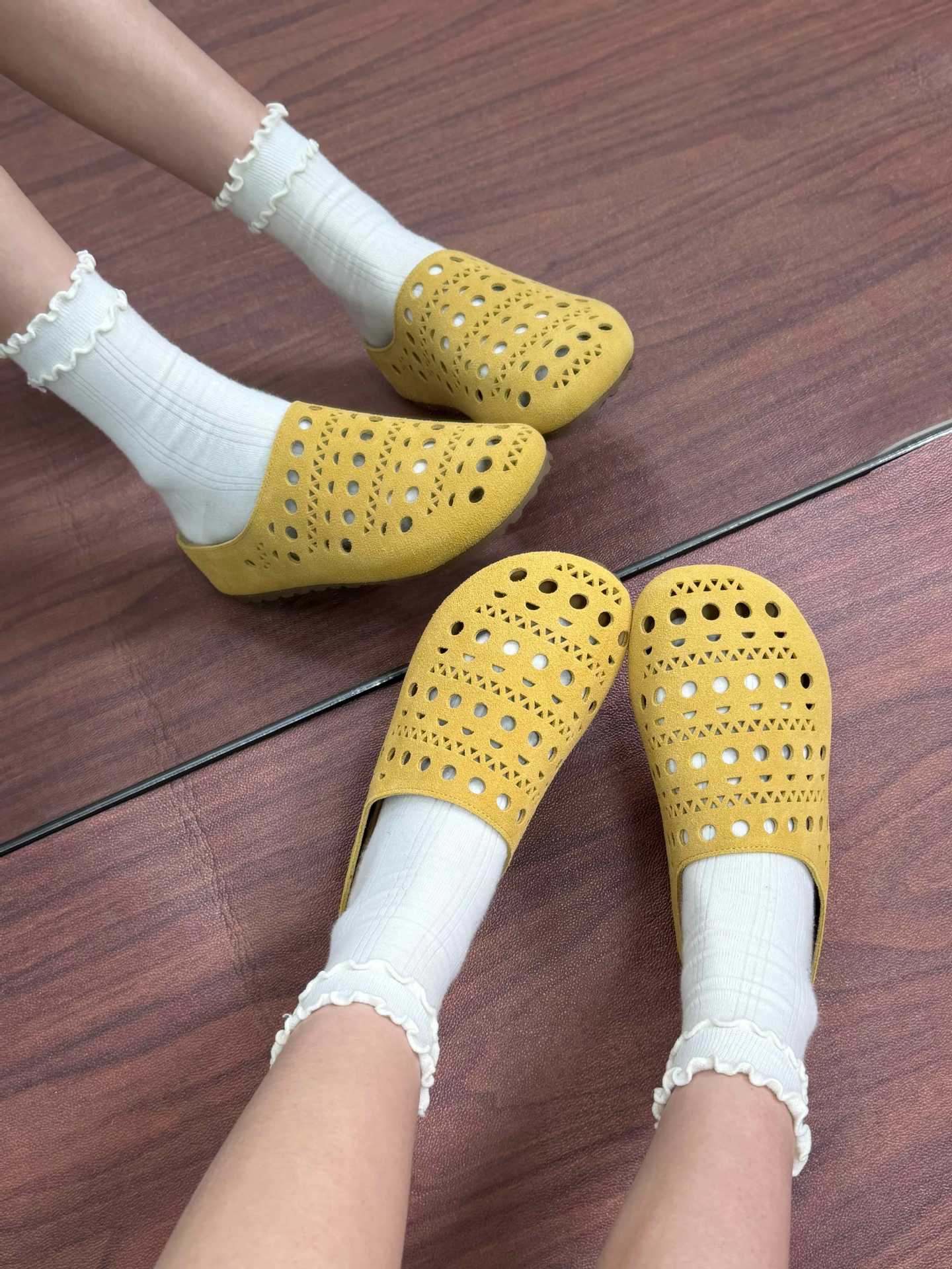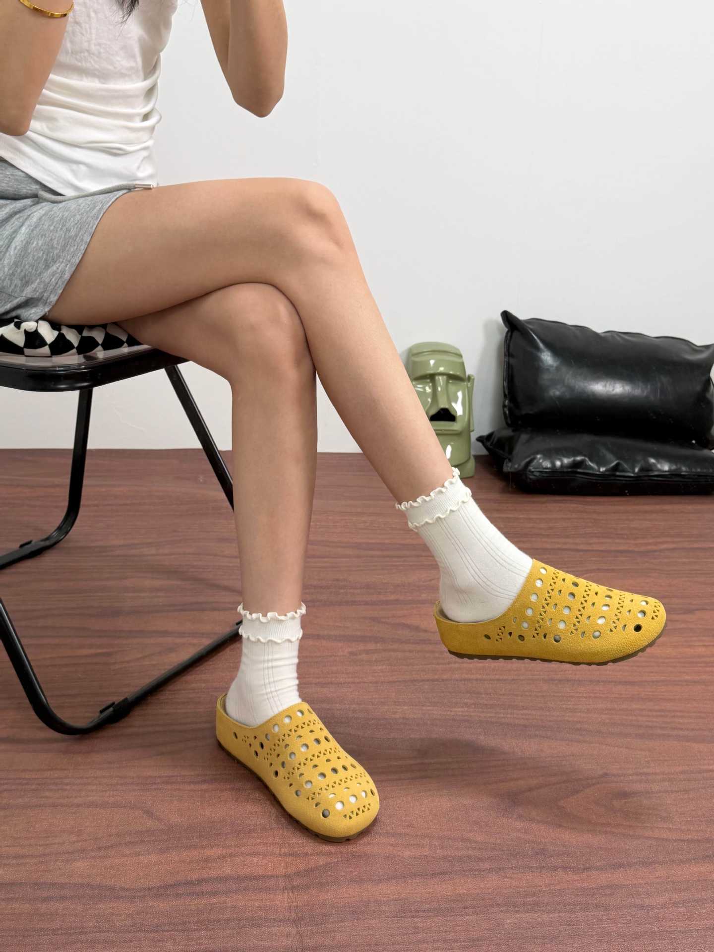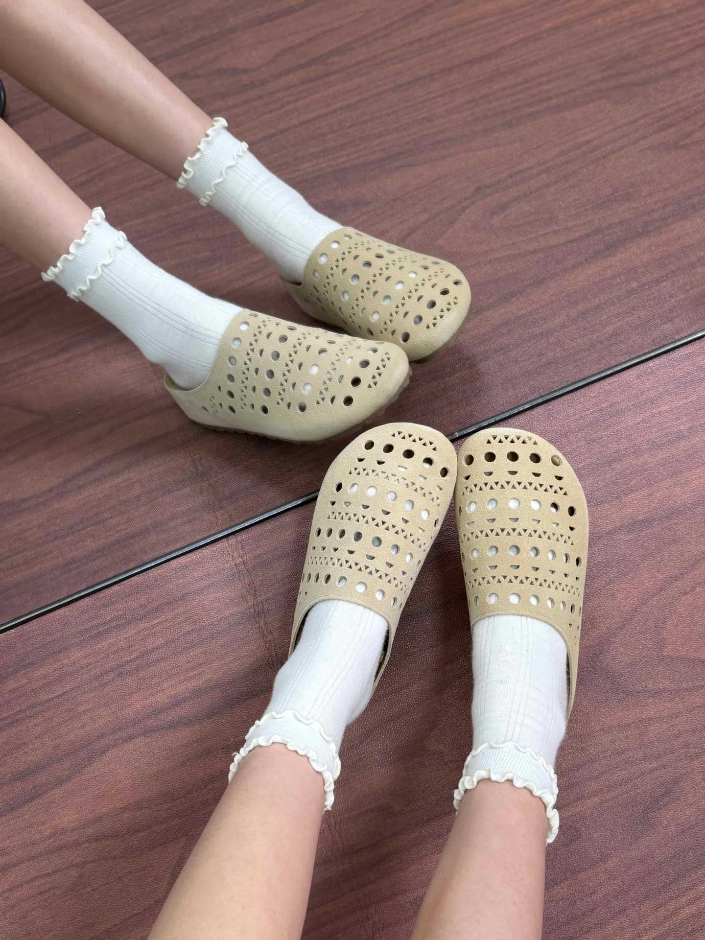 牛皮版夏季新款真皮生巧奶芙時髦鏤空雕花包頭厚底懶人勃肯半拖女