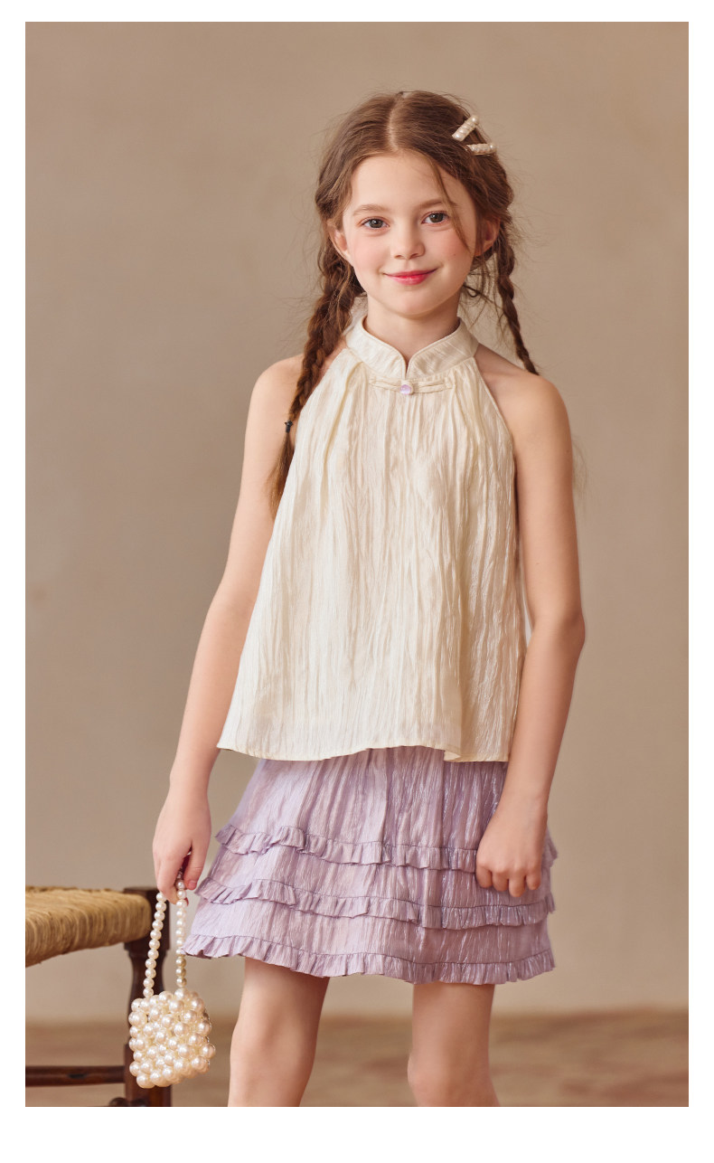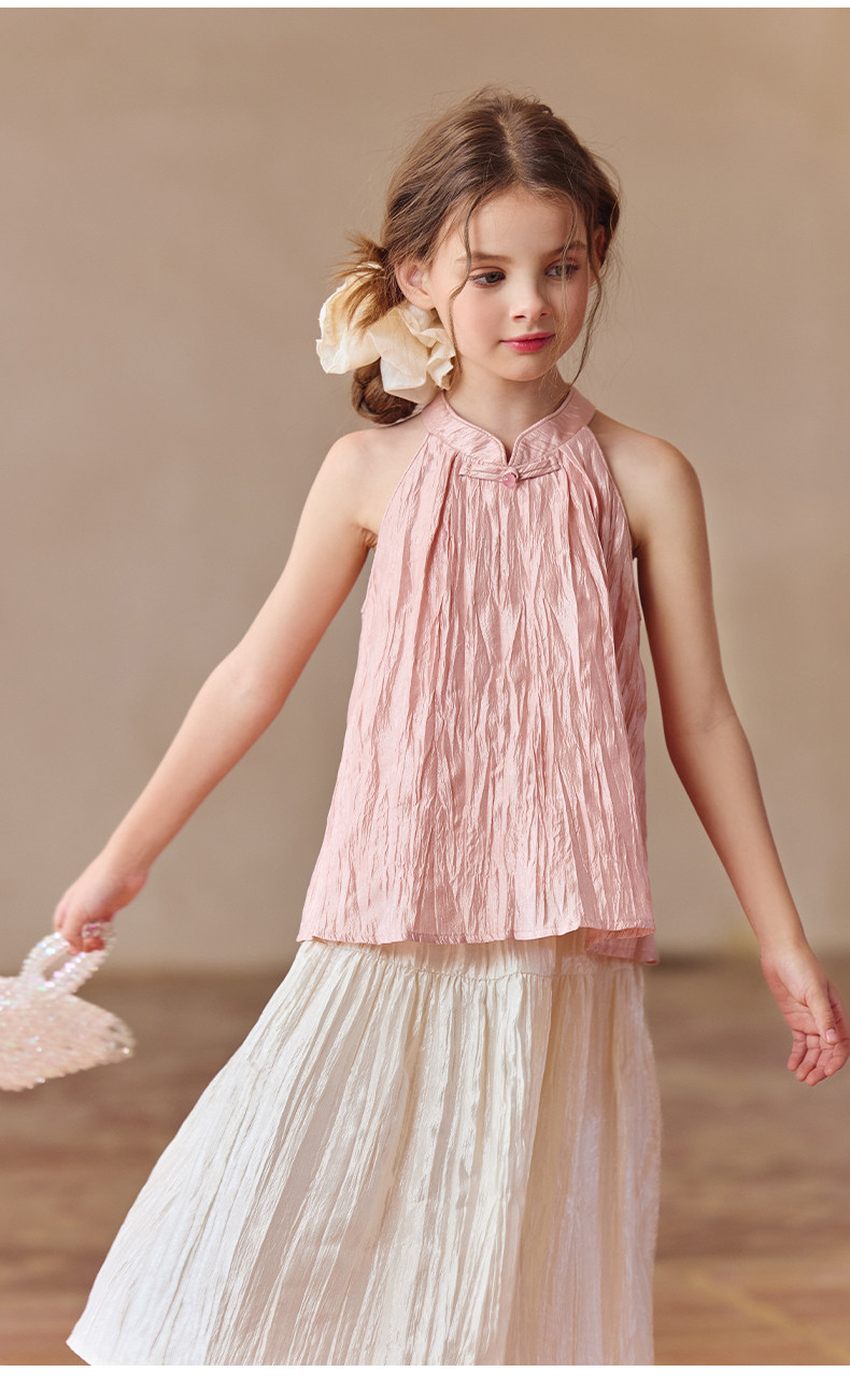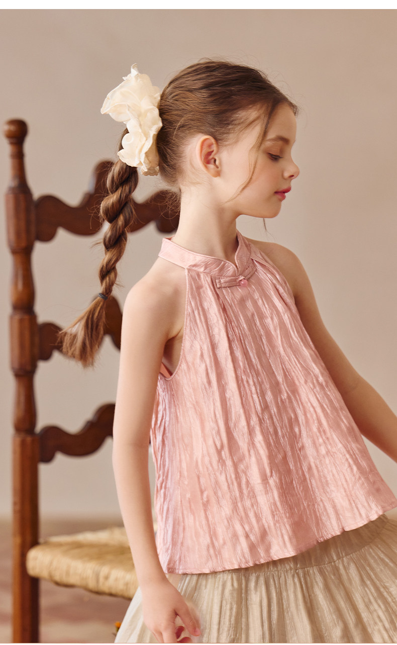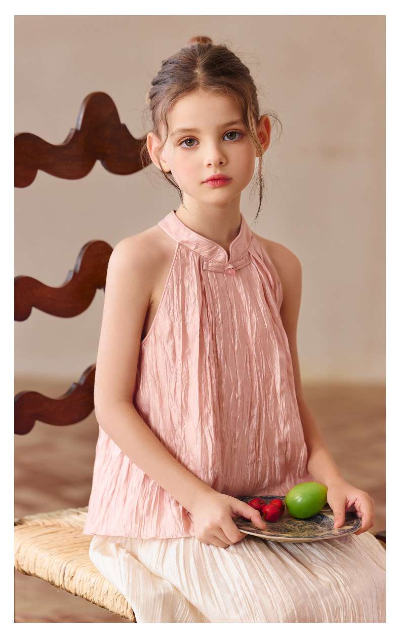 Little Naive兒童中式T恤夏季新款掛脖旗袍領上衣女童光澤背心