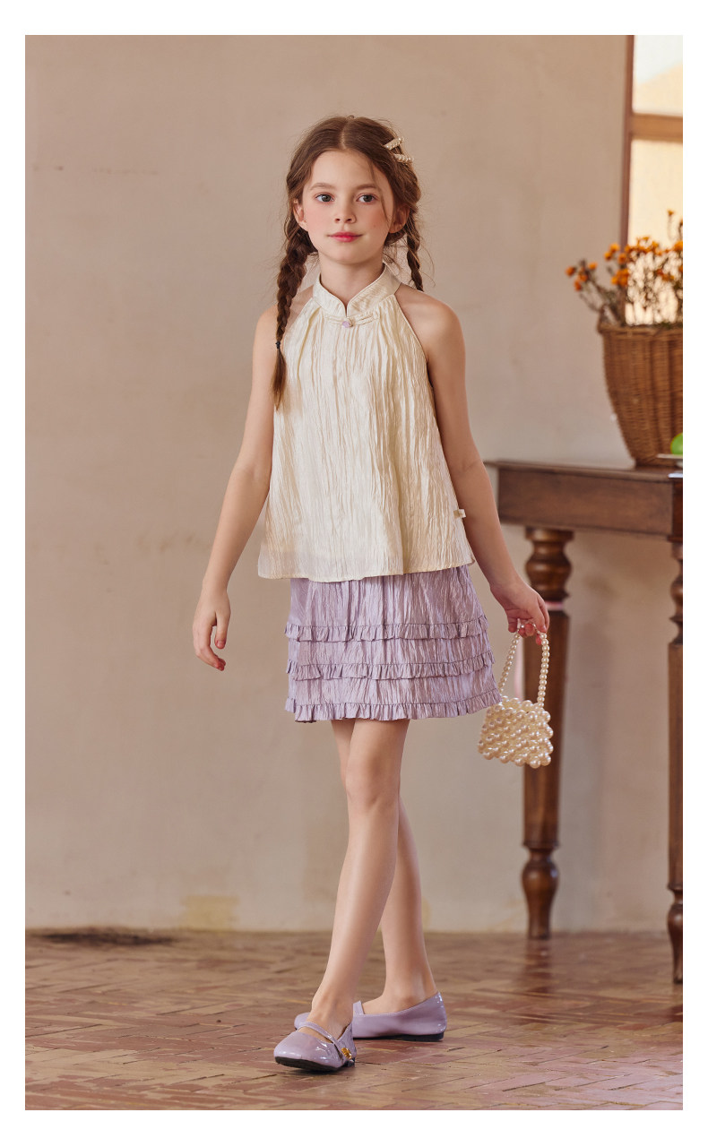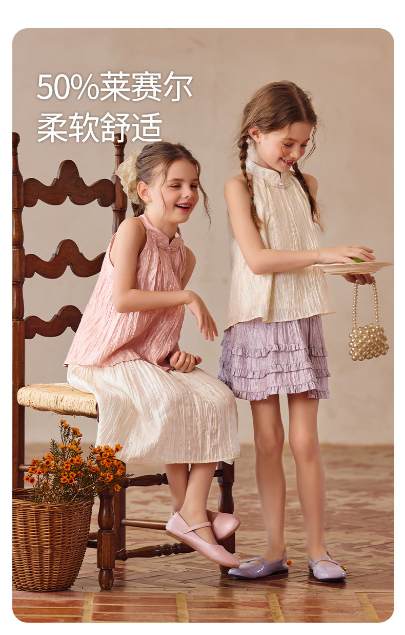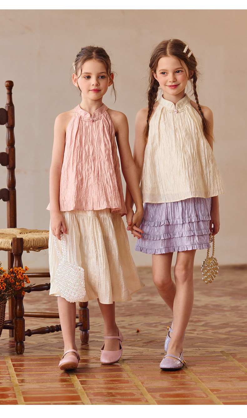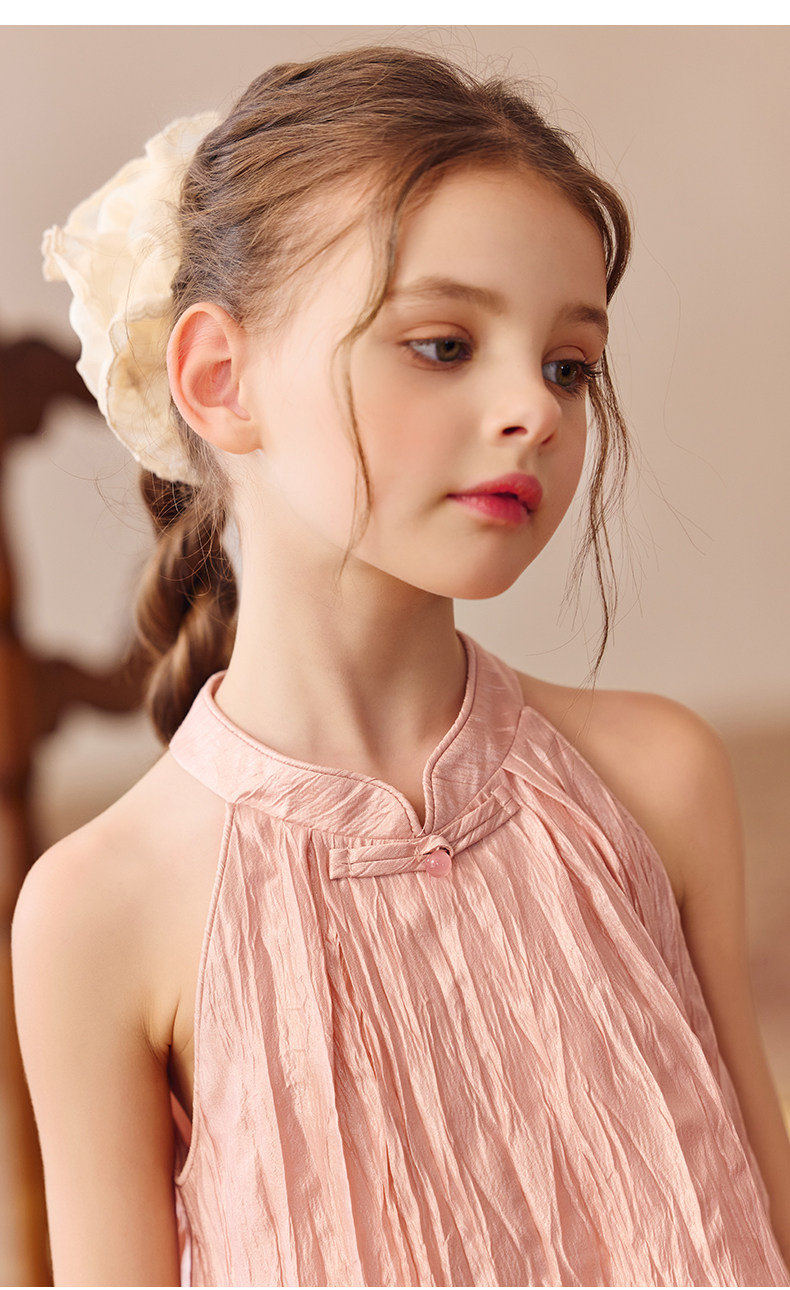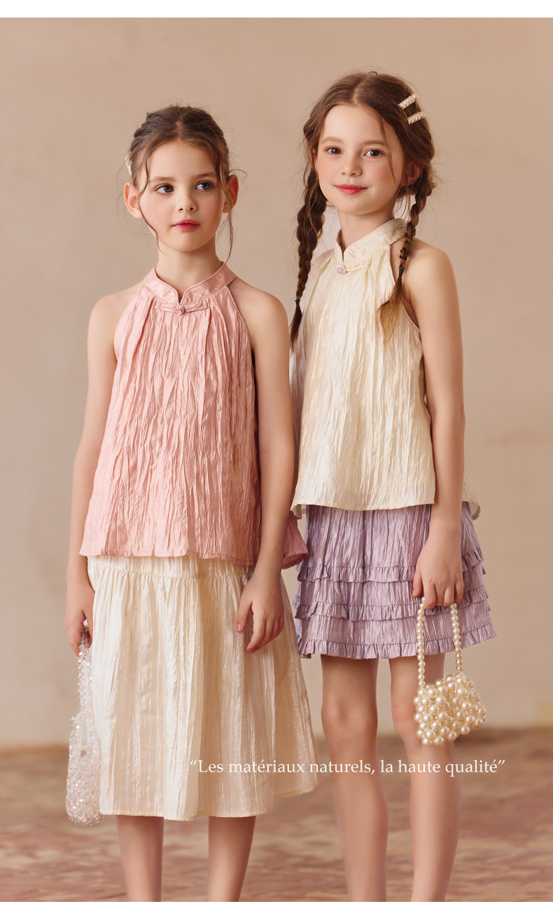 Little Naive兒童中式T恤夏季新款掛脖旗袍領上衣女童光澤背心