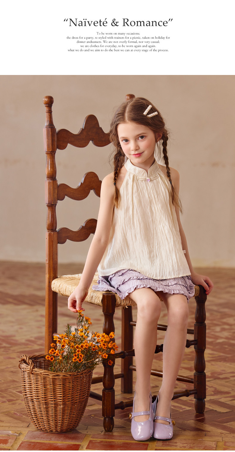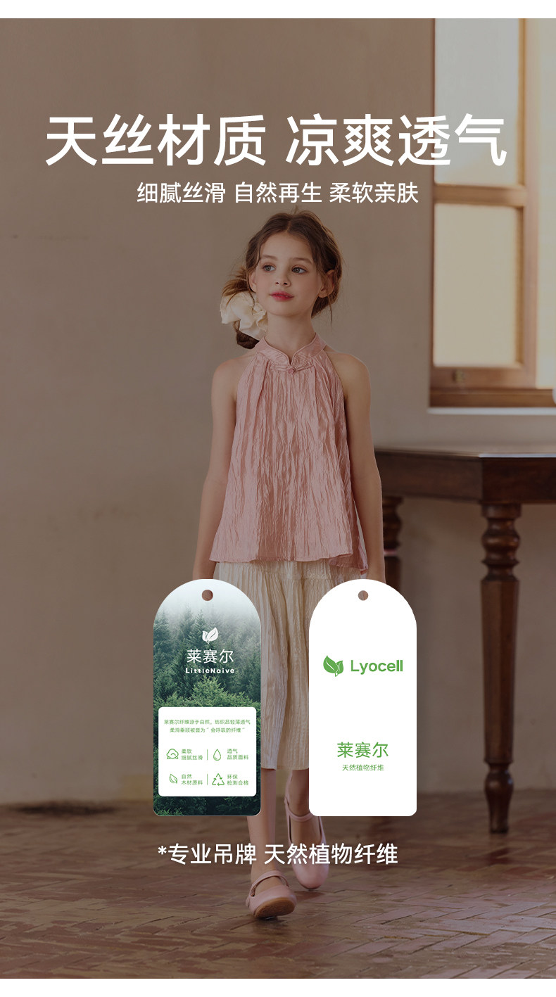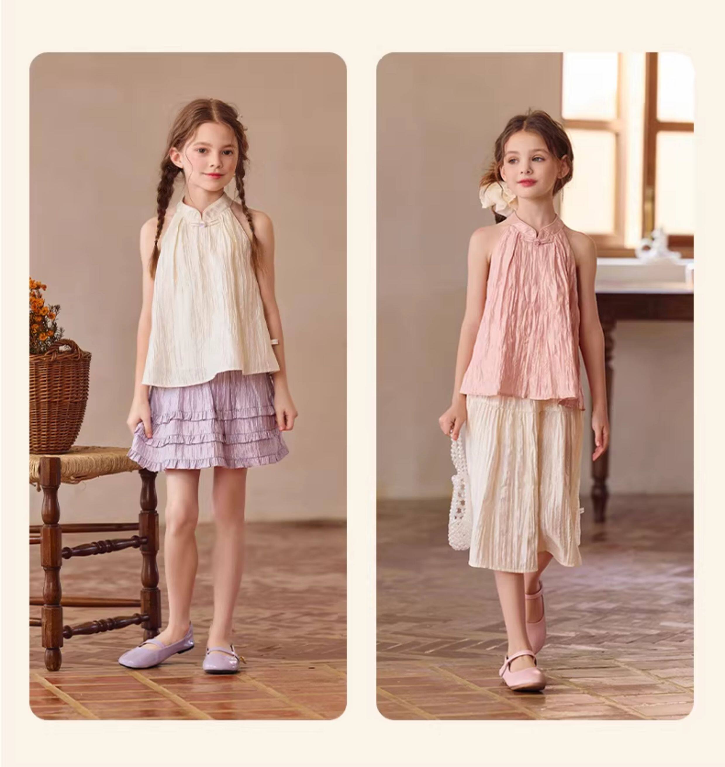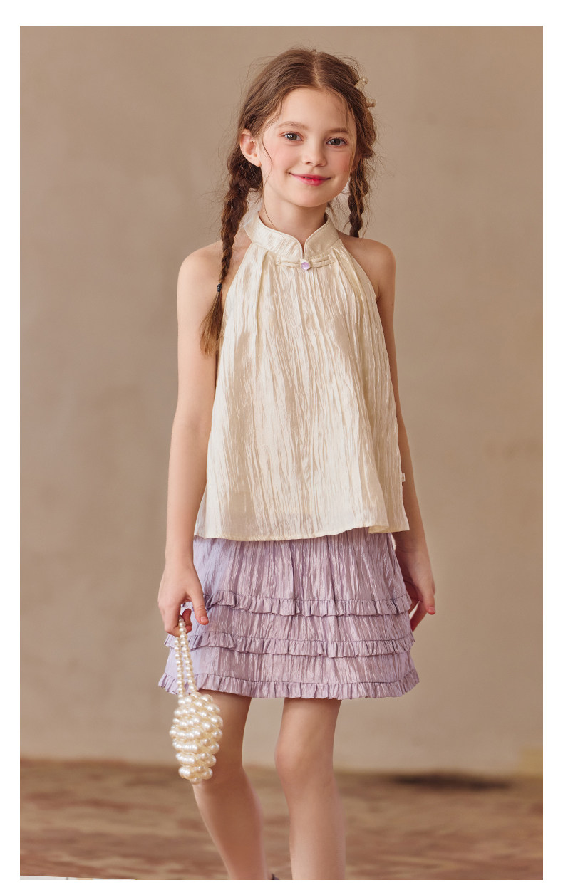 Little Naive兒童中式T恤夏季新款掛脖旗袍領上衣女童光澤背心