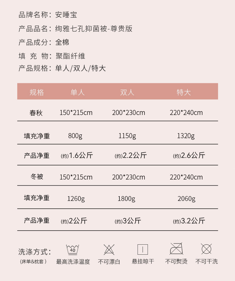 安睡寶A類抗菌全棉七孔被子被芯四季春秋被單人棉被被雙人被褥