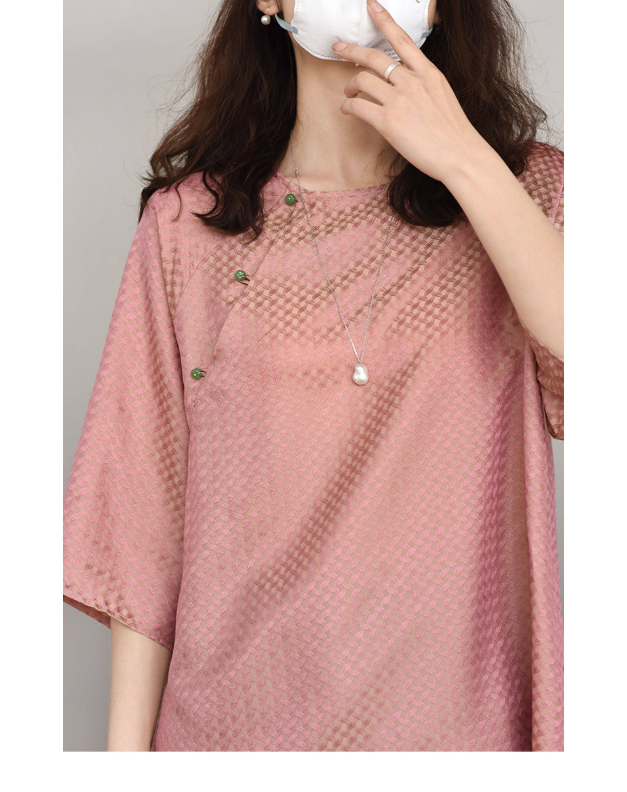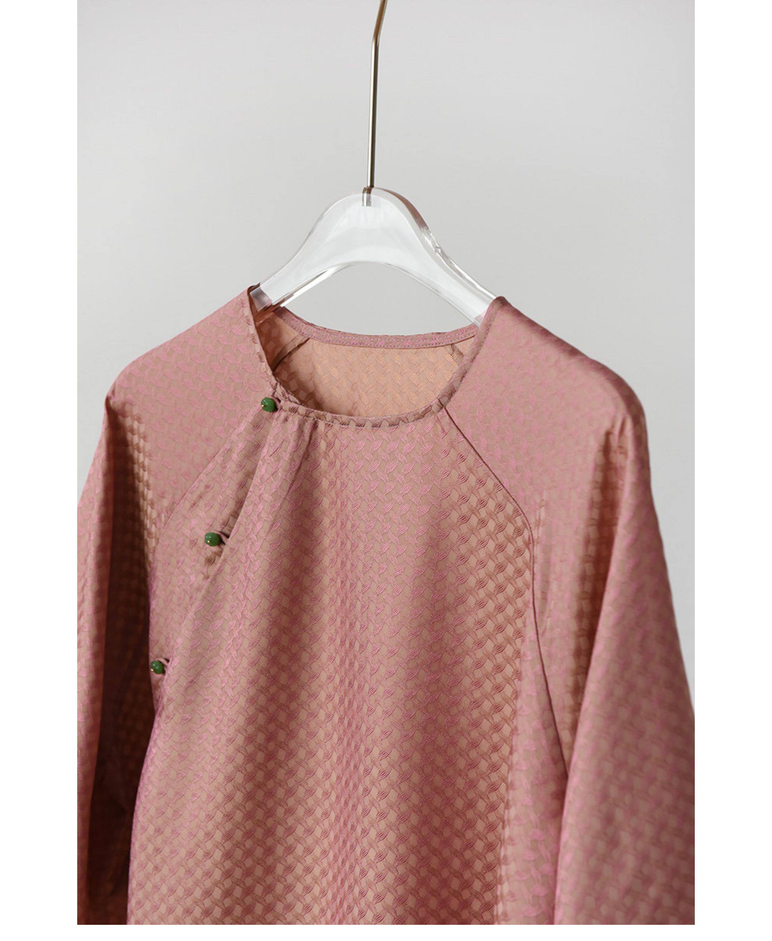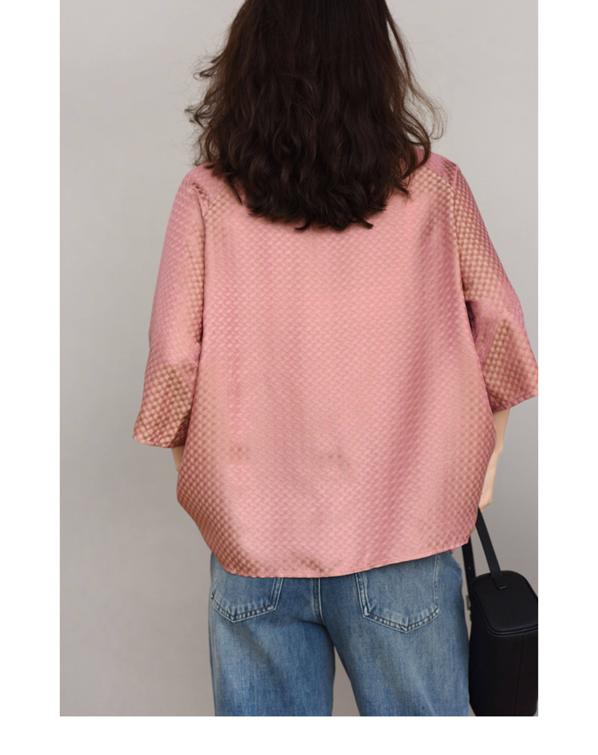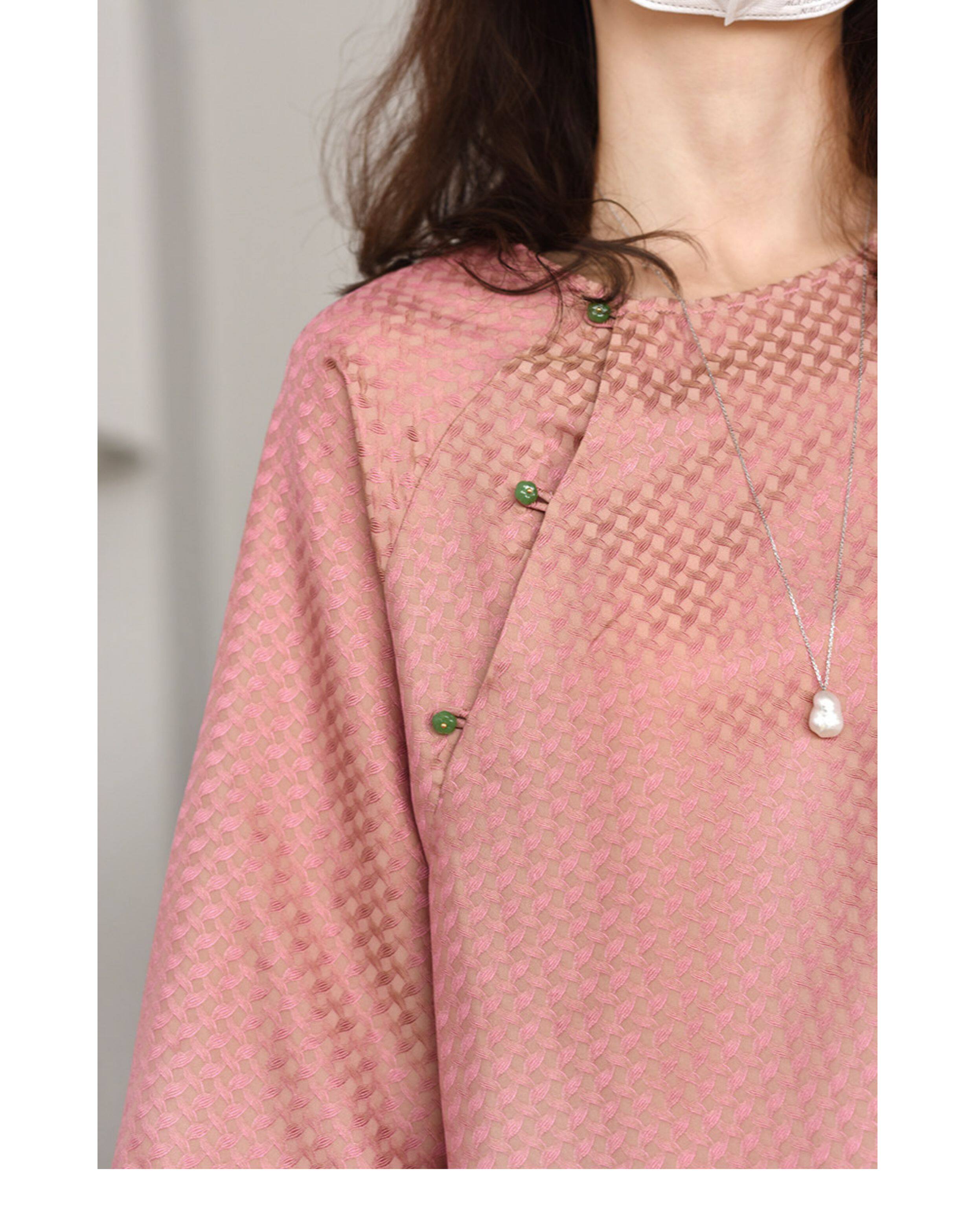 富貴閒人裝 新中式真絲提花斜門襟花朵玉石中袖襯衫 古風氣質款