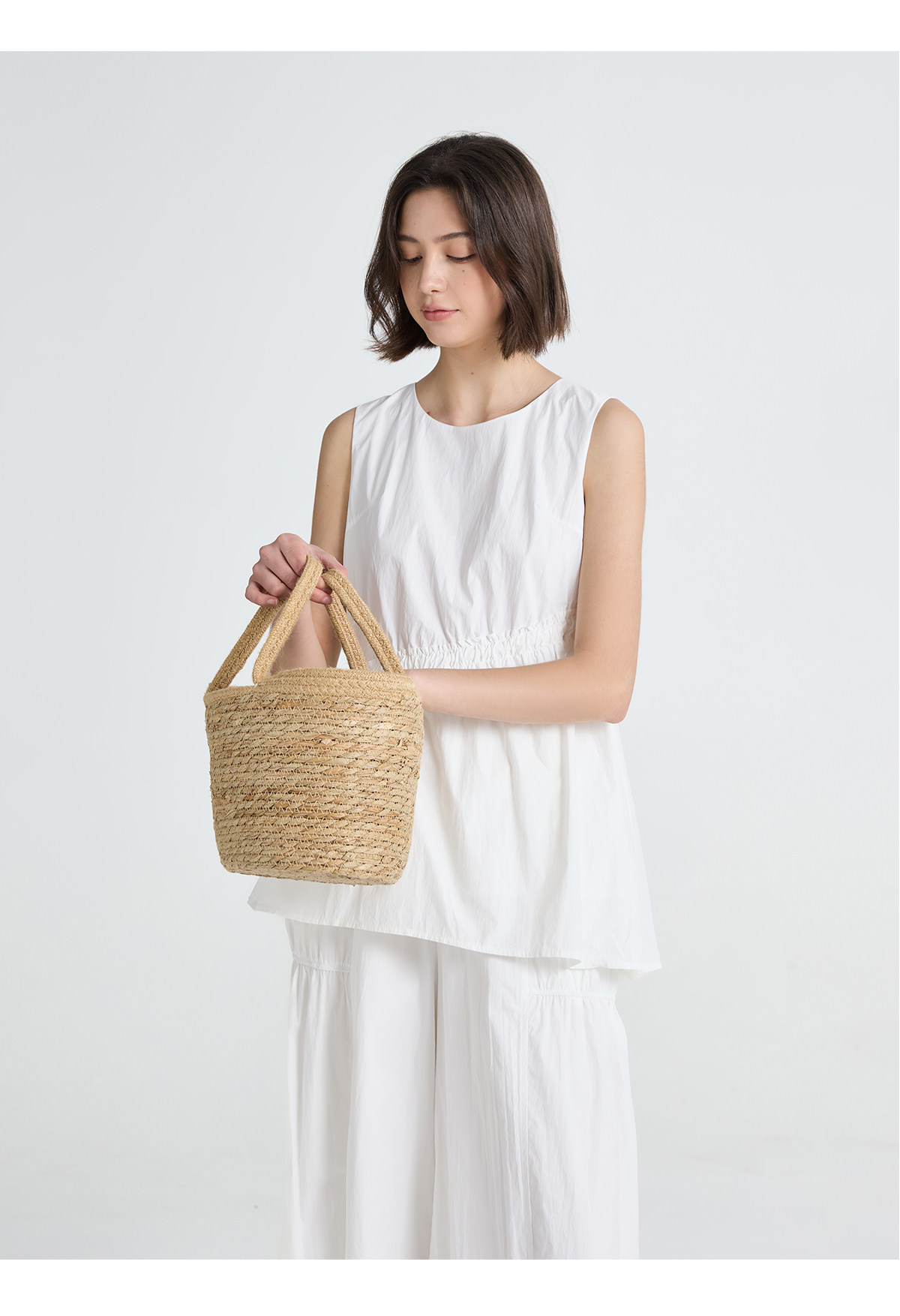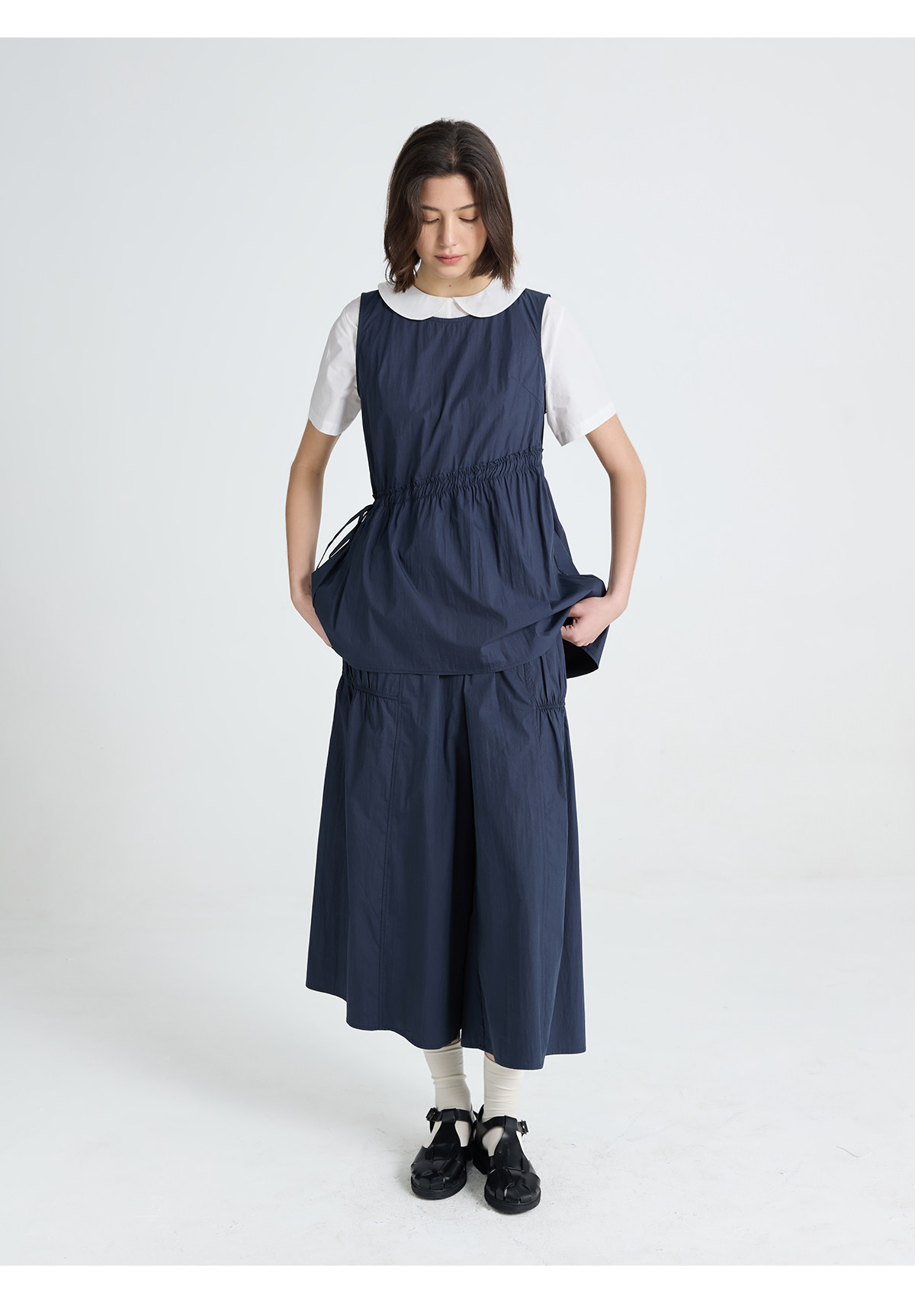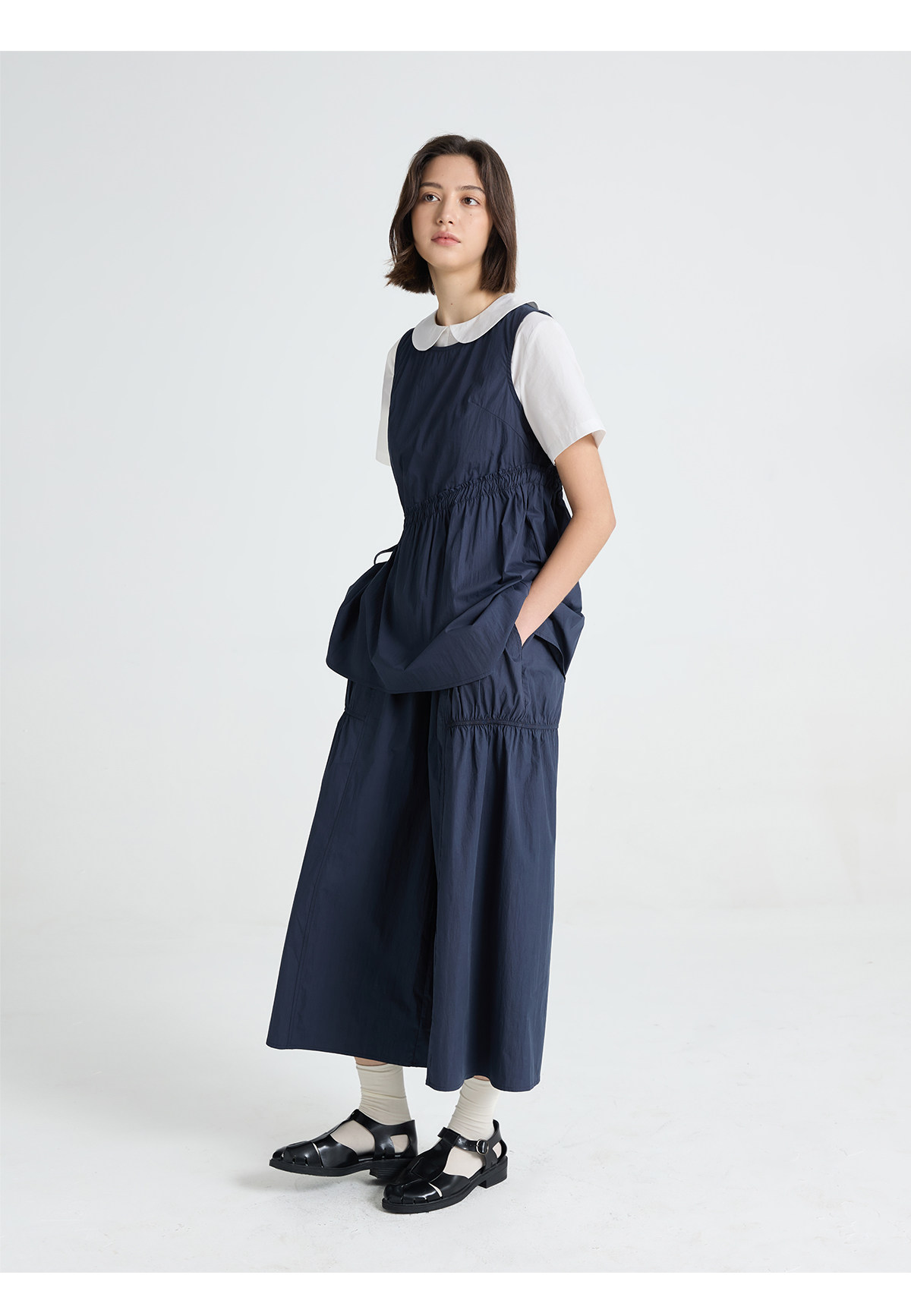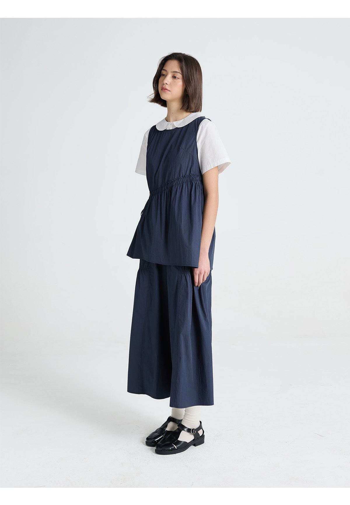 今南JINNAN 圓領無袖襯衫壓褶兩件套女濶腿直筒九分褲通勤套裝